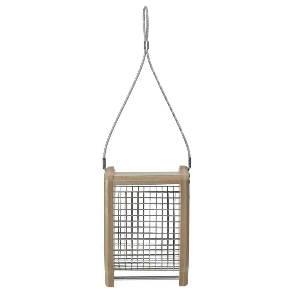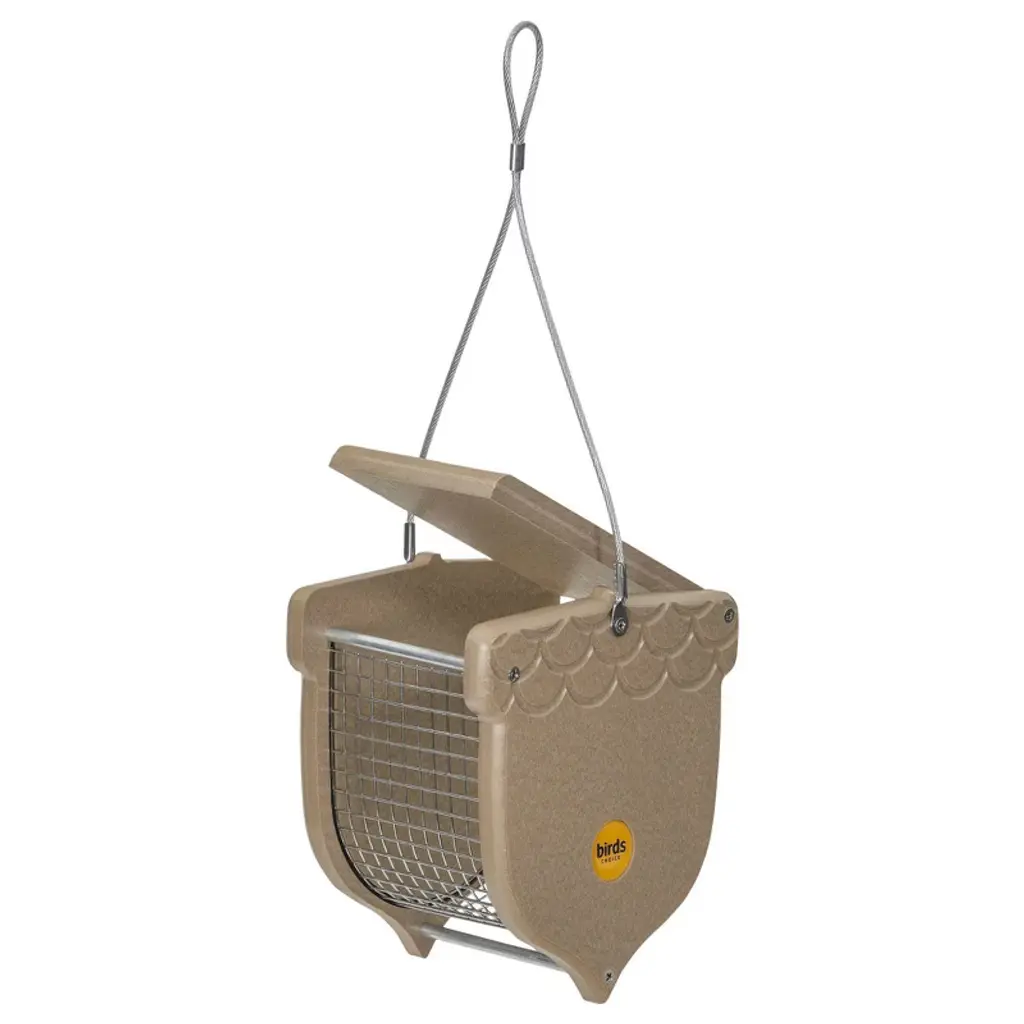 Perfect for shelled peanuts or whole sunflower seeds.Unique acorn shape adds interest to your yard or garden, hang it in a tree to double as a decoration.Easy-open top makes refilling a breeze - 1 quart capacity.Made from recycled poly lumber, highly resistant to splits, cracks and fading - lasts for years.Stainless steel screen is durable and easily holds up to harsh weather; Dimensions are 6" x 4" x 7"