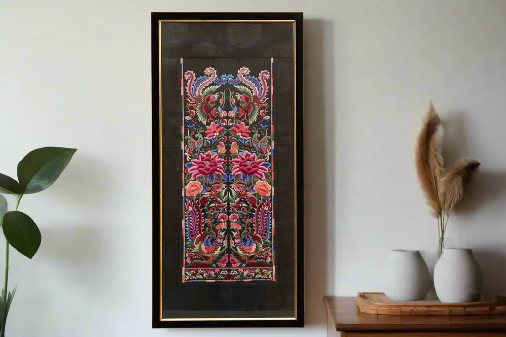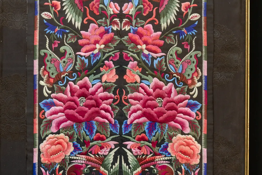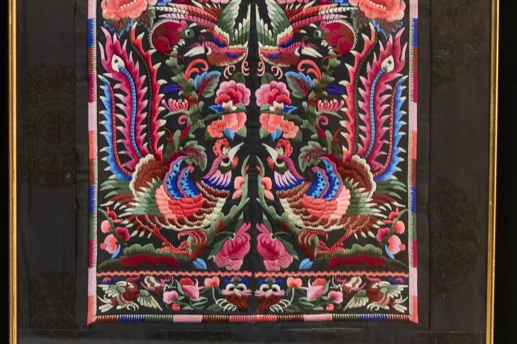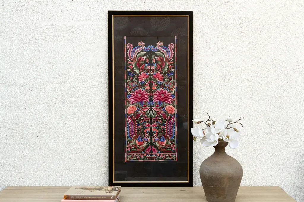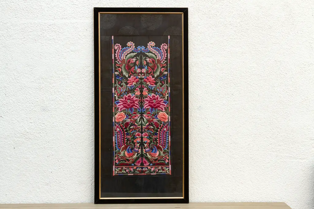 This exquisite textile panel, adorned with a vibrant tapestry of birds and blossoms, captures the essence of Chinese embroidery artistry. Likely dating back to the late Qing Dynasty or early Republic period (circa late 19th to early 20th century), this piece showcases the meticulous craftsmanship and symbolic richness that characterize Chinese textile traditions. The central motif features a pair of majestic birds, their plumage rendered in a symphony of colors, flanking a blossoming tree.