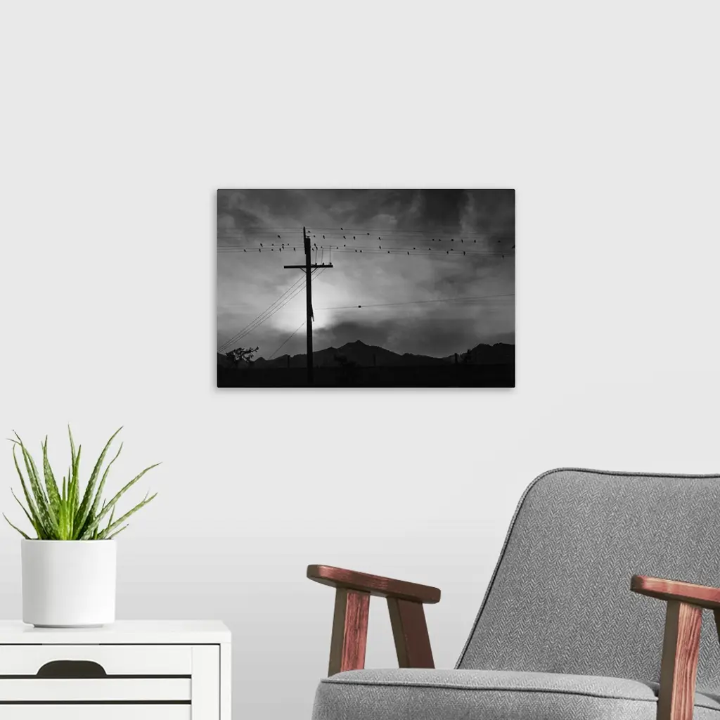 Birds on a telephone wire at the Manzanar Relocation Center in California. Photograph by Ansel Adams, 1943.