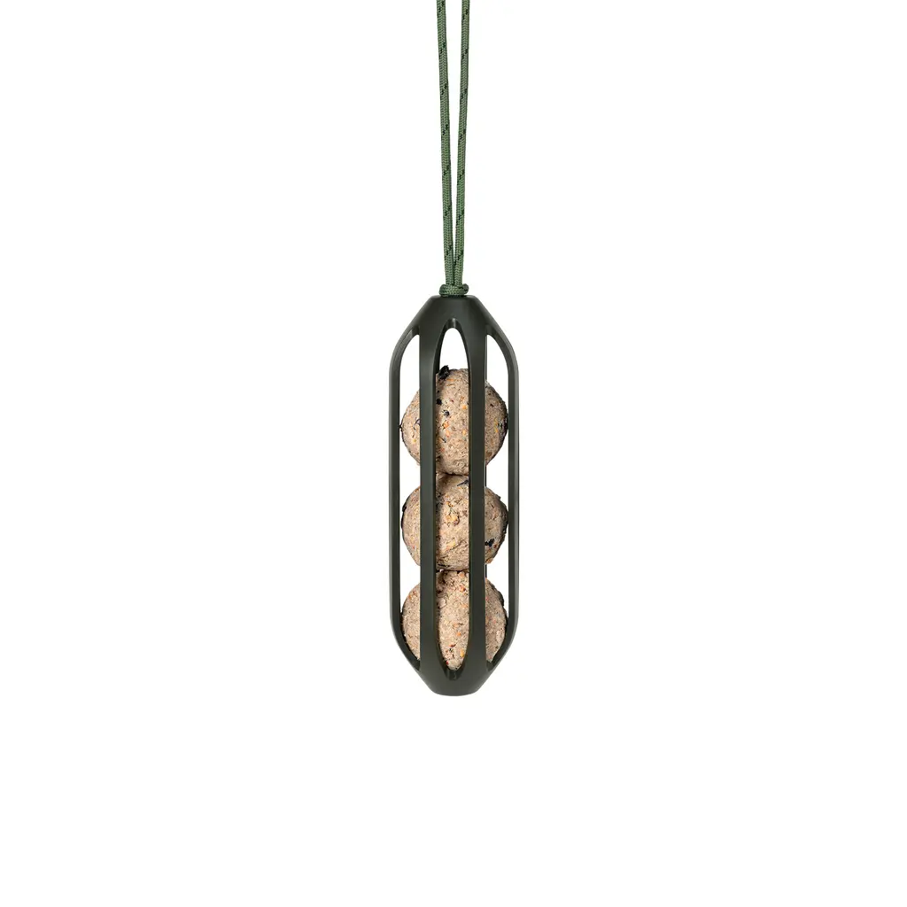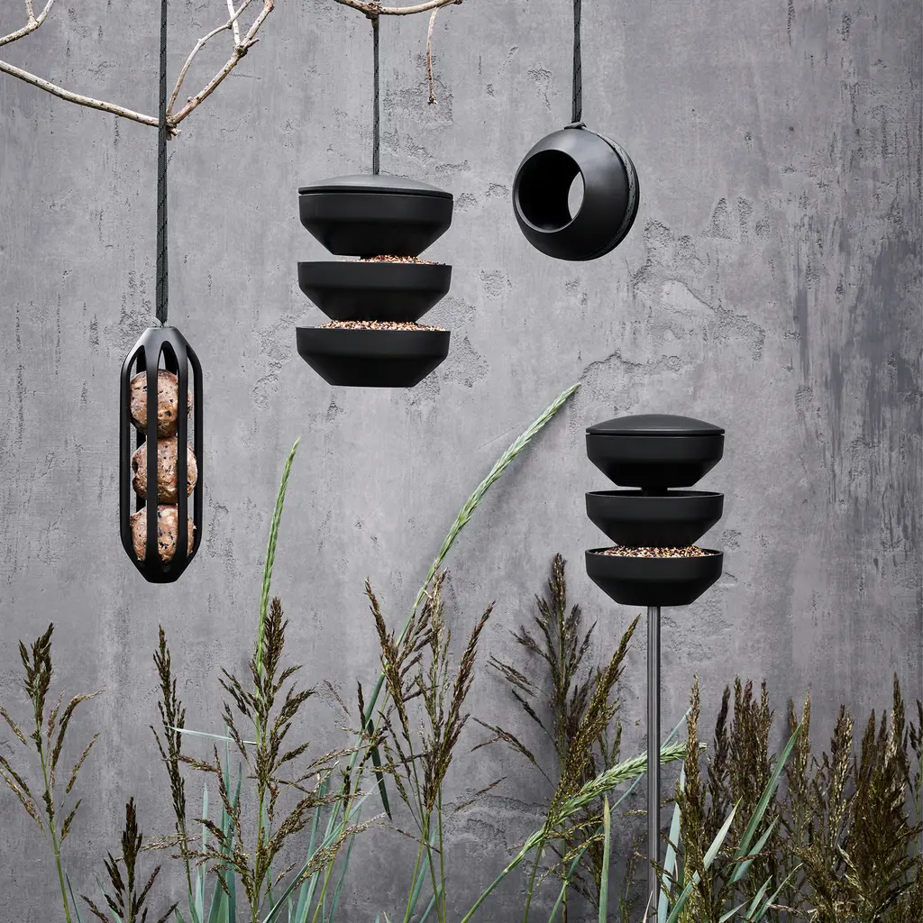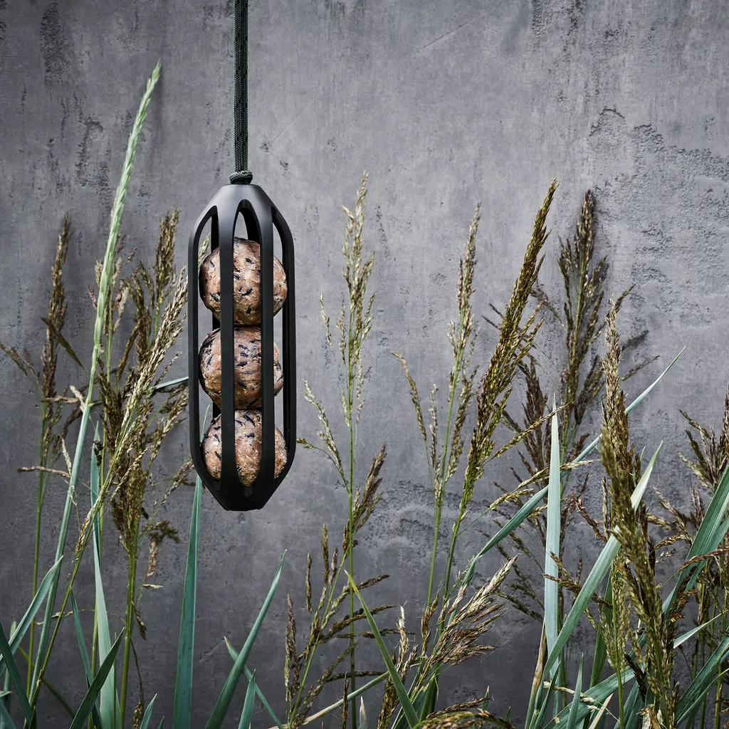 During winter, food sources are scarce. Offering a steady supply of suet can help birds thrive and stay healthy until spring arrives. With the Rosendahl Birds Suet Ball Feeder, you can do that and also make your outdoor living space look modern. Part of a series created by Danish designer Signe Wenneberg, this suet ball holder has an elegant, elongated form and a dark color palette to blend into a garden perfectly. The interior can hold several suet balls, with the large openings allowing birds to feed comfortably. A suspension cord offers an easy way to hang the Birds Suet Ball Feeder from a branch or a hook. To open the feeder for refills, simply pull the cord slightly. Like other bird feeders from this collection, this modern suet ball feeder for birds is manufactured in Denmark from 100% recycled materials in a circular process that reduces the product’s environmental impact significantly. The material is also durable and resistant to both impact and frost.