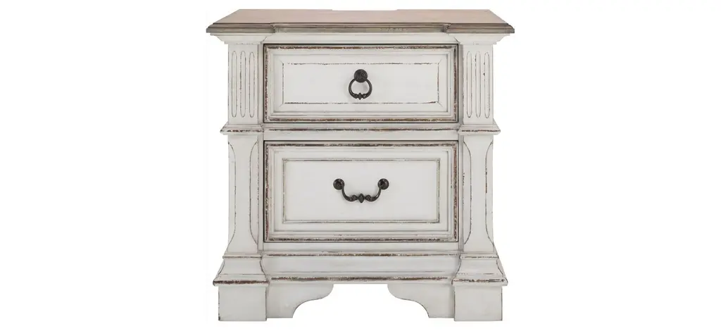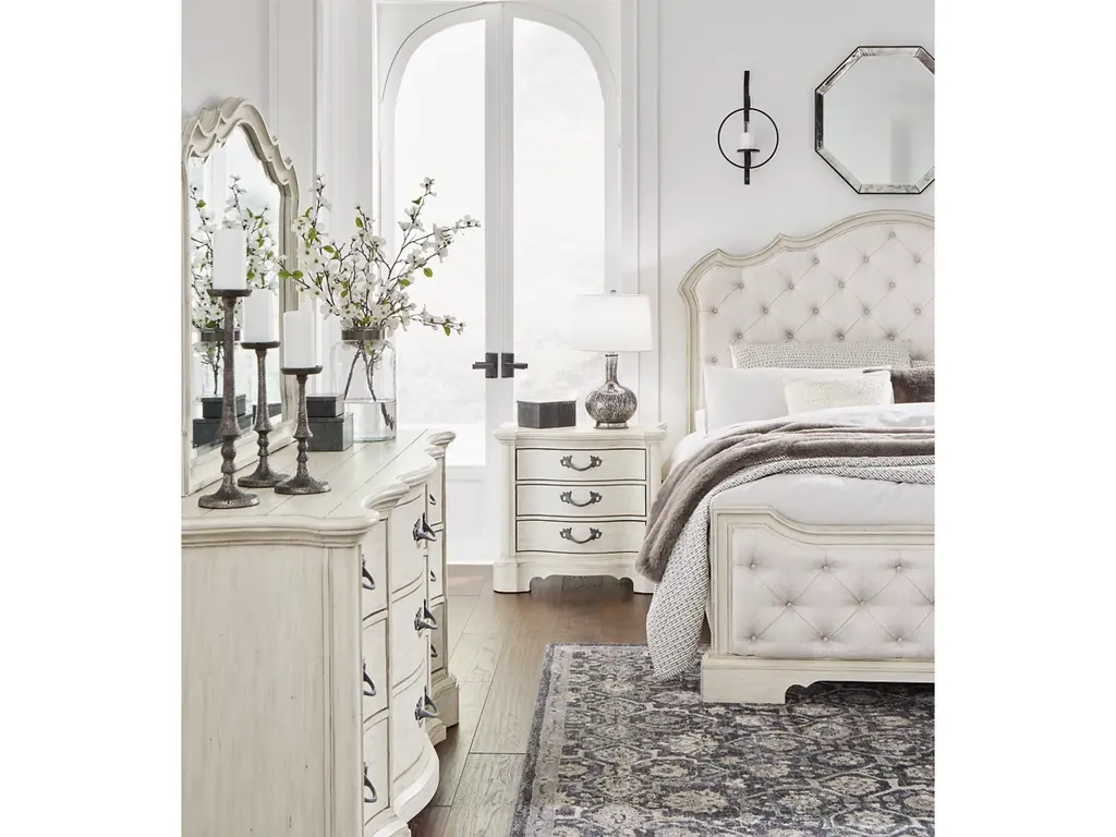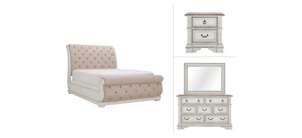 Traditional elements get a fresh new face with the Birmingham 4-pc. king bedroom set. This set is all about functionality, but doesn't sacrifice style. The distressed white finish of this set brings forward a rustic, country aesthetic accented by two types of antiqued drawer pulls. The bed frame, adorned with upholstered headboard and footboard with button tufting and in a classic sleigh style, is the centerpiece of this set. Plus, the nightstand features 2 USB ports for easy charging of your favorite devices. With 9 drawers in this set, you'll never lose room to store all of your things.