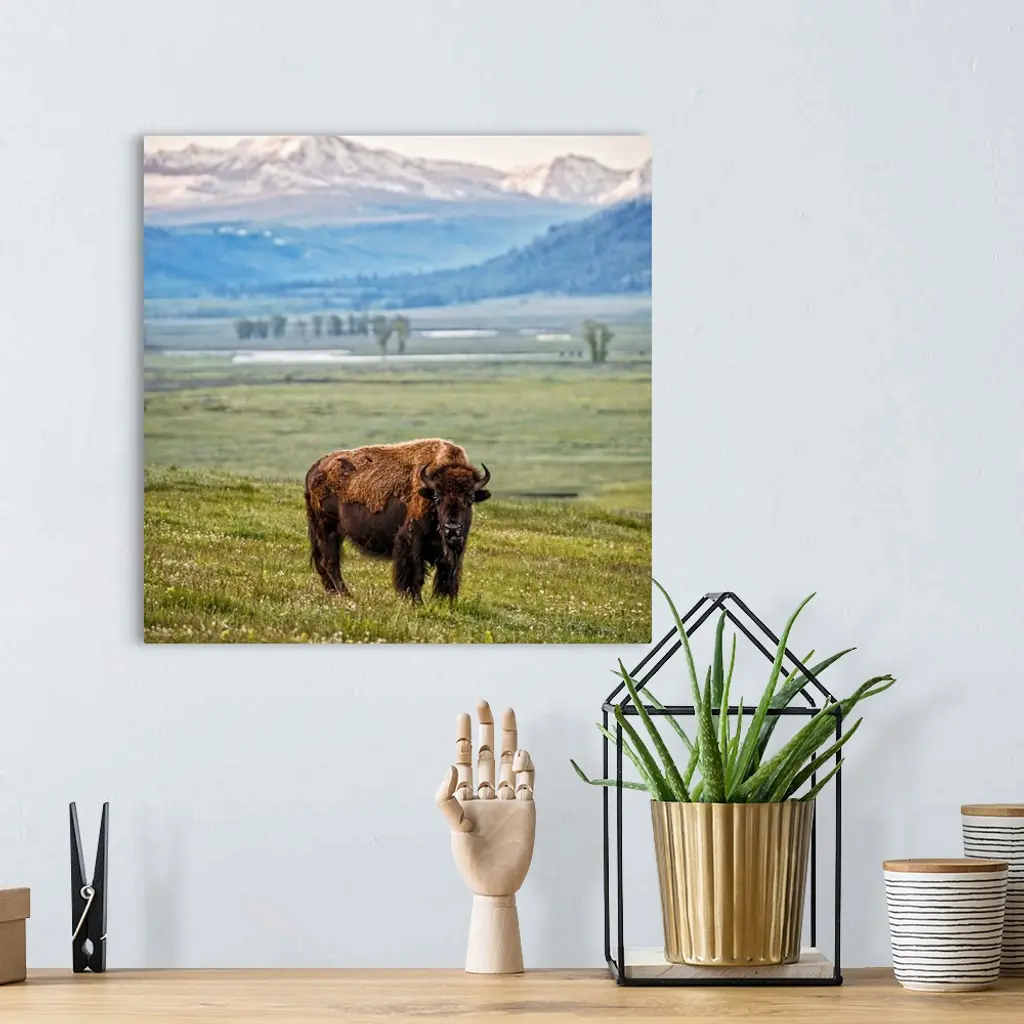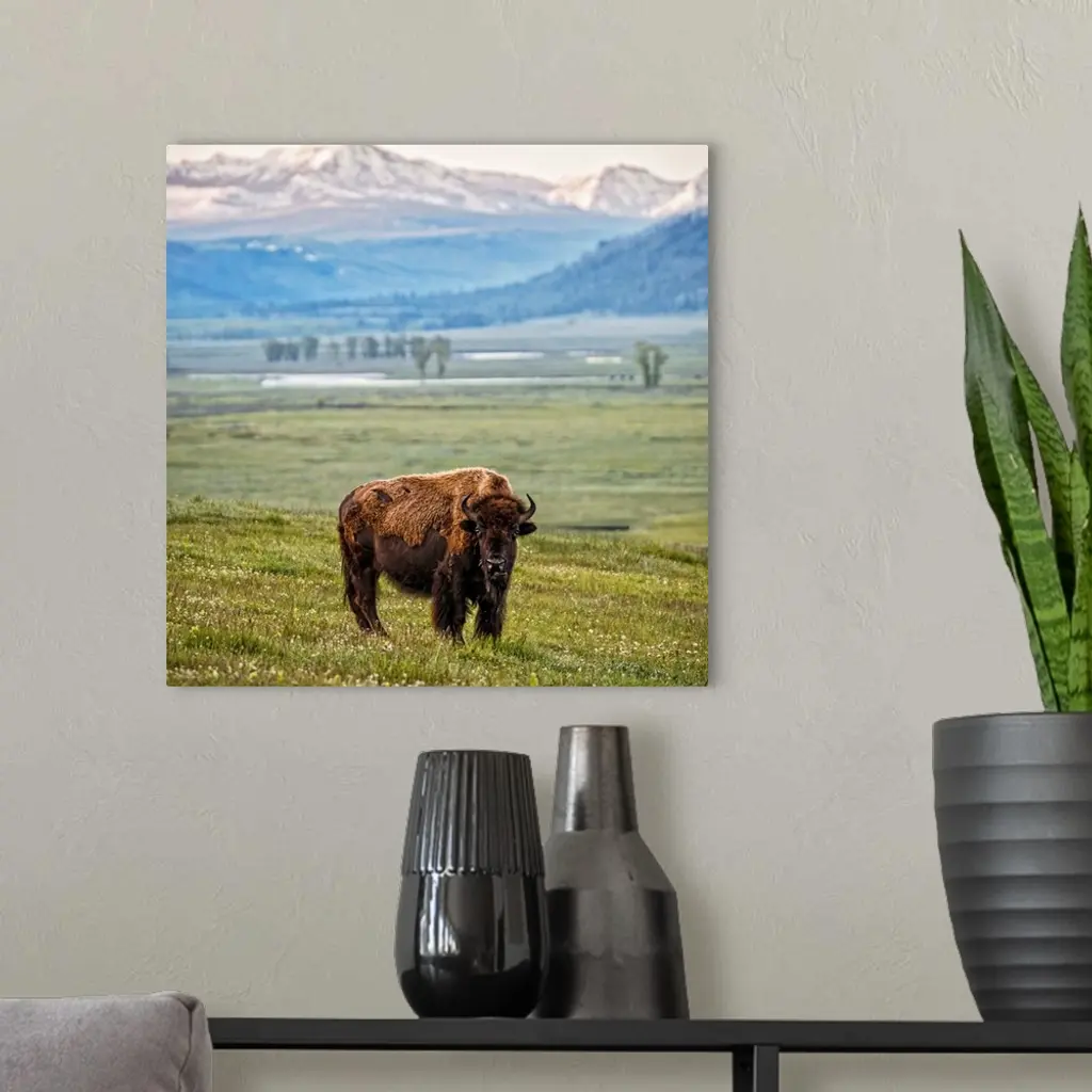 A bison in a meadow overlooking the mountains of Yelllowstone National Park.