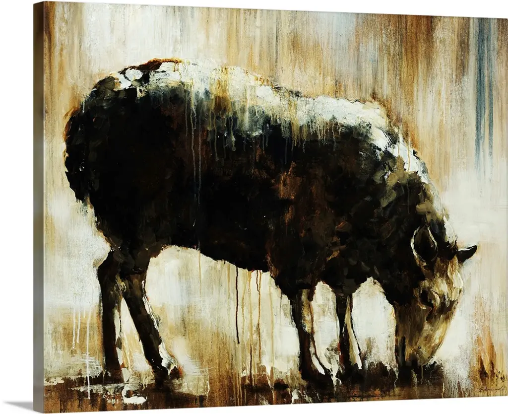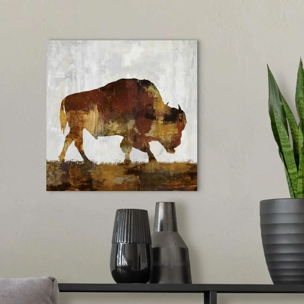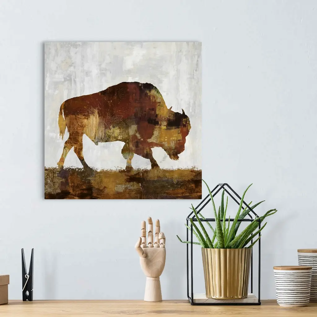 Square decor with a brown and gold silhouette of a bison on a gray, tan, and white background.