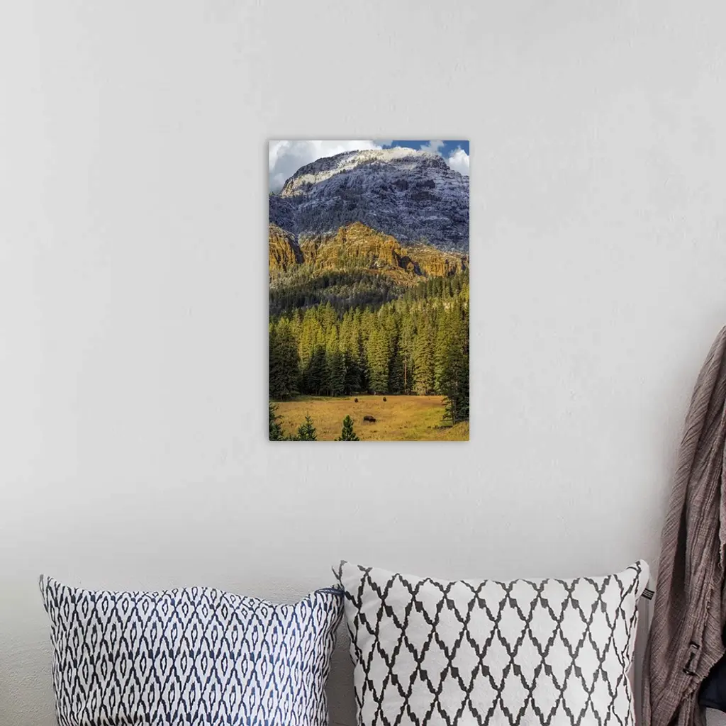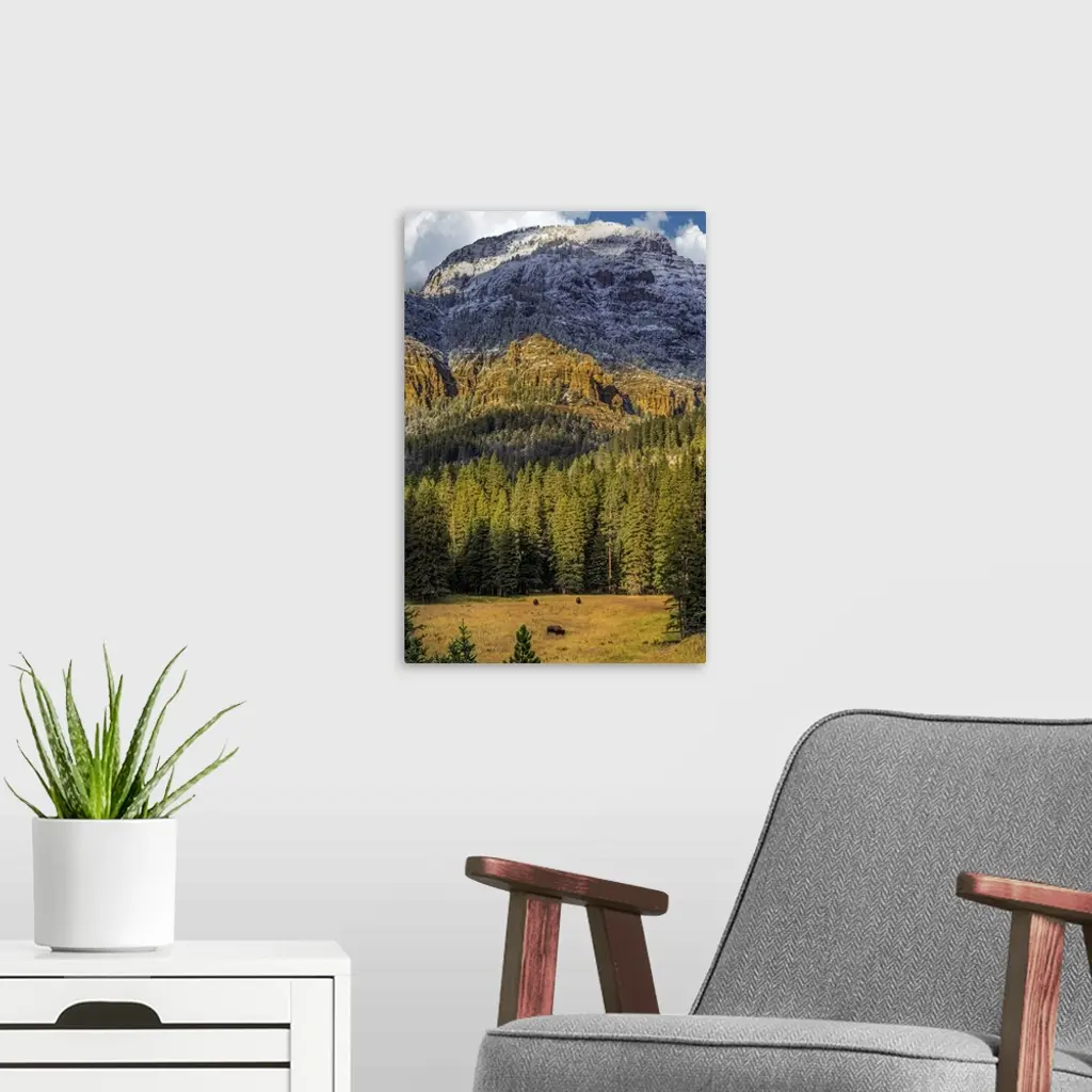 A photograph of bison grazing in a clearing in front of a thicket of forest, with mountains in the background.