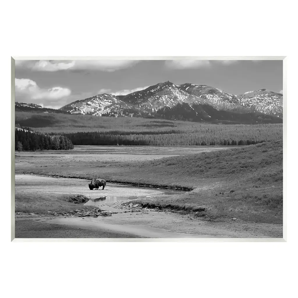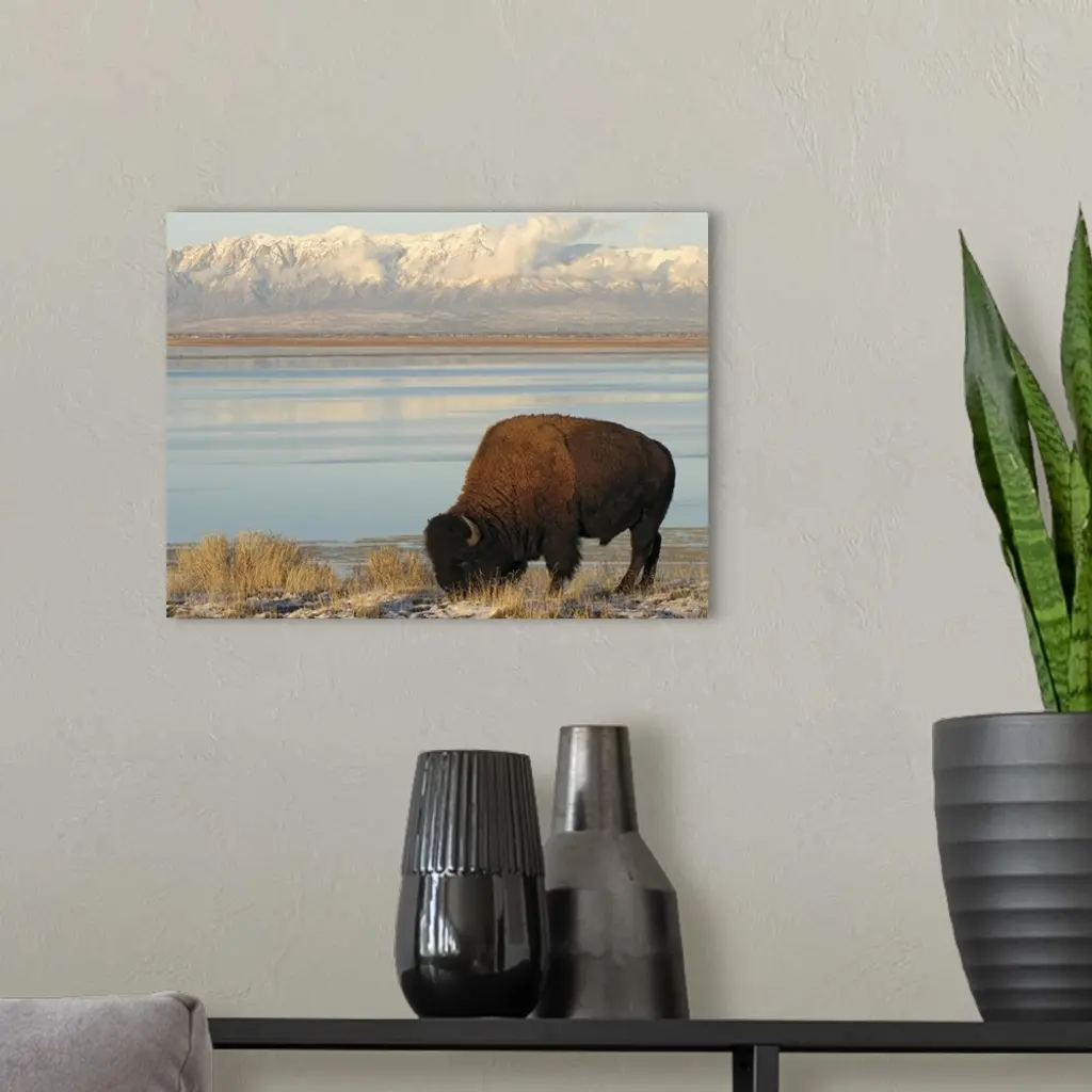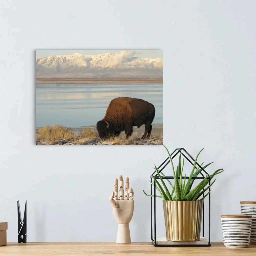 Bison grazing in winter on Antelope Island in Great Salt Lake with snowy Wasatch Mountains in background.