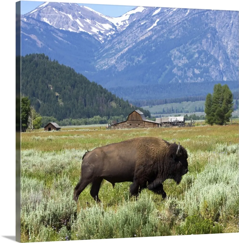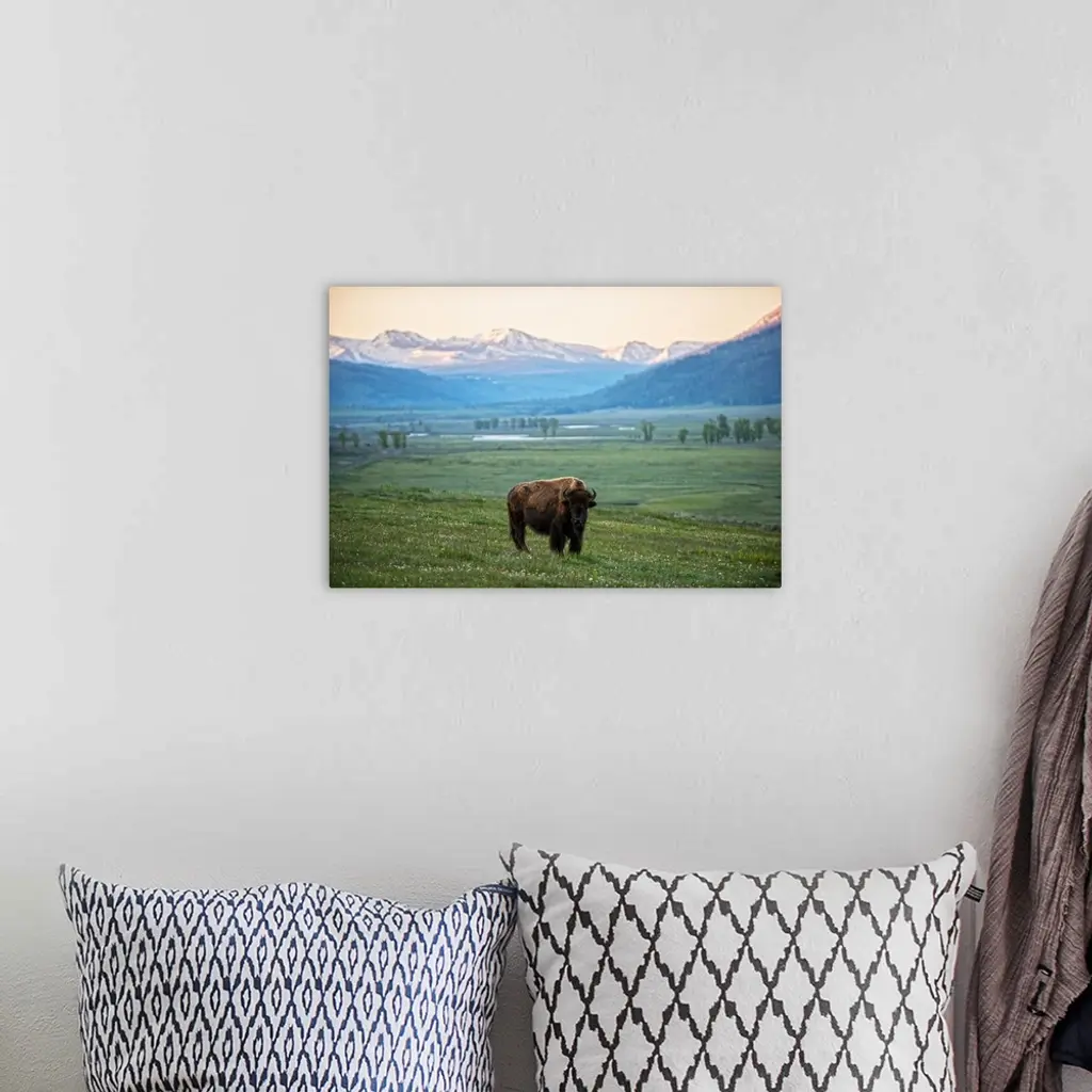 Bison In A Field With Rocky Mountains In View, Yellowstone National Park