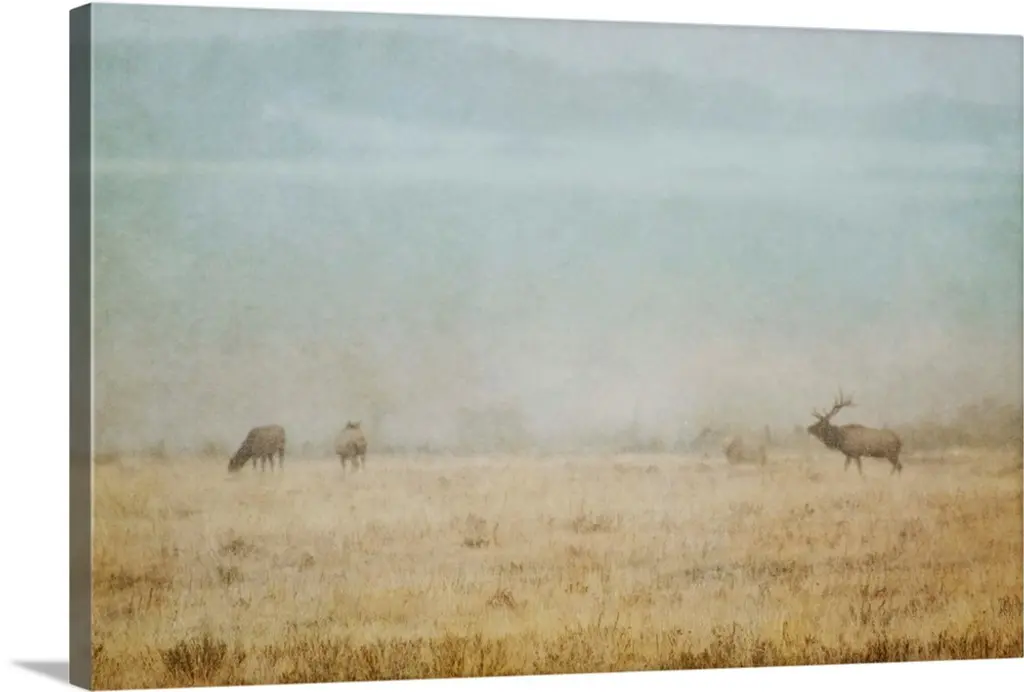 Two bison in a field of mist at Yellowstone National Park, Wyoming.