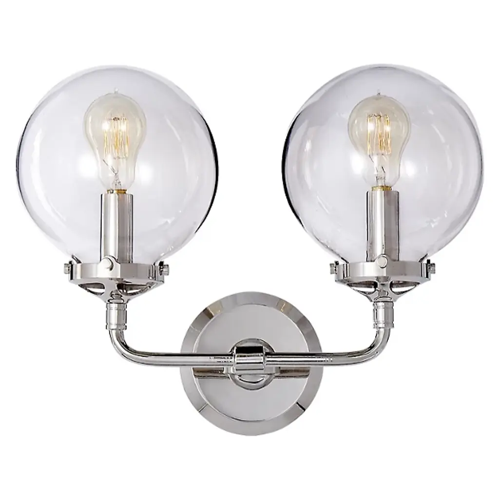 Give your space an industrial edge with the Bistro Clear Glass Bath Bar by Visual Comfort Signature, formerly known as Visual Comfort, Its unique design features a series of spherical Clear glass shades supported by a shared wallplate, dramatically curved stems, and metal holders with knob accents. Once lit, inner decorative Edison bulbs create a warm, relaxing ambiance ideal for bathroom settings.