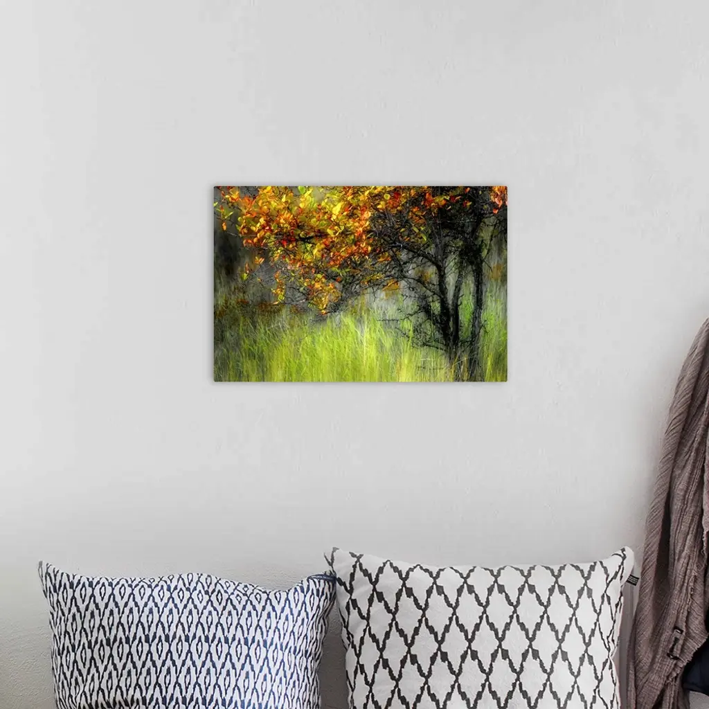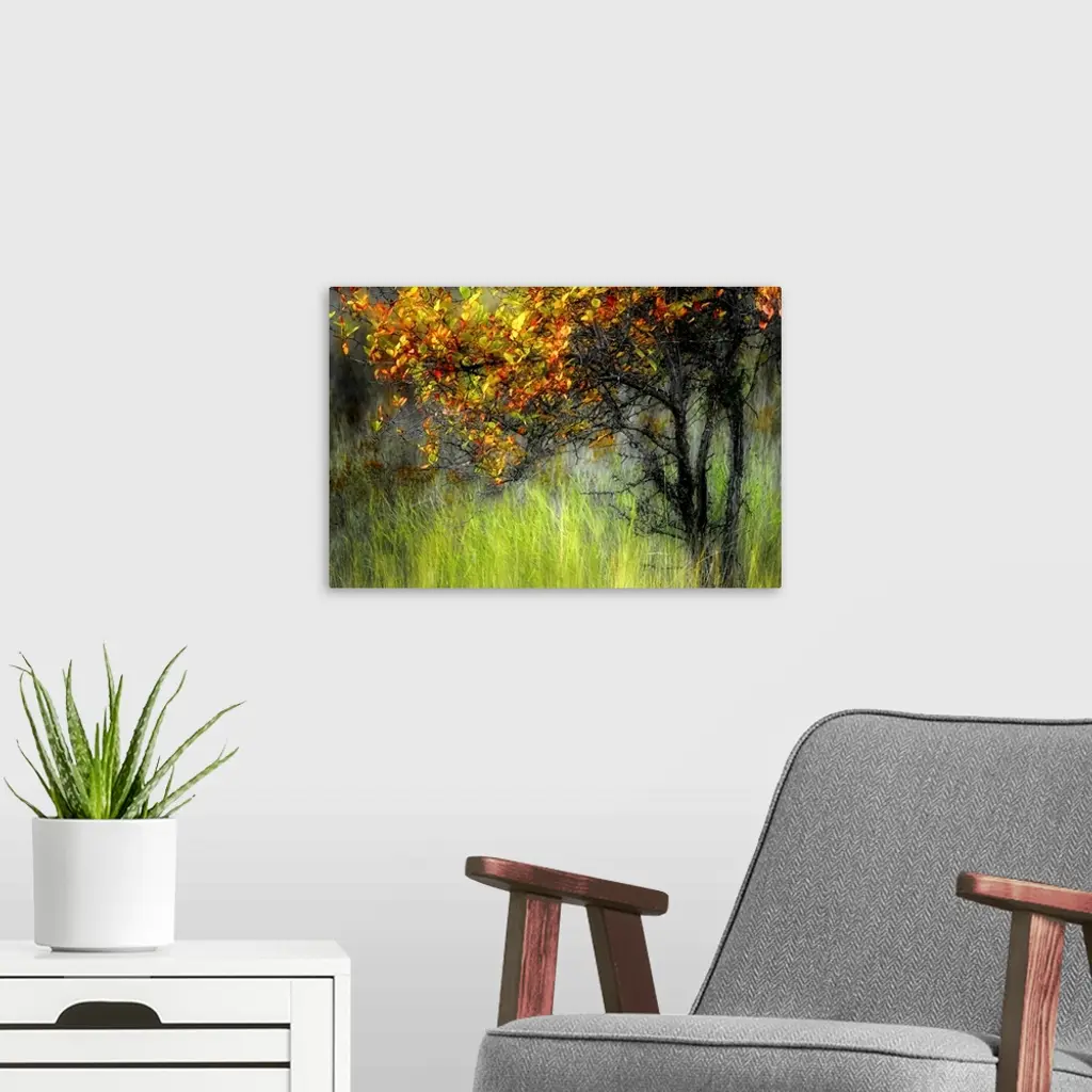 Photograph of tree covered in autumn leaves surrounded by tall grass.