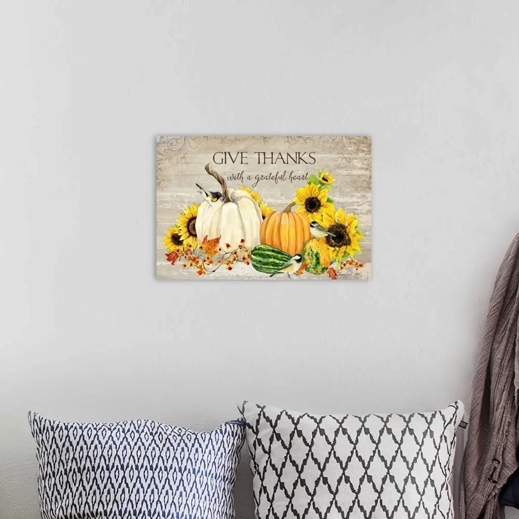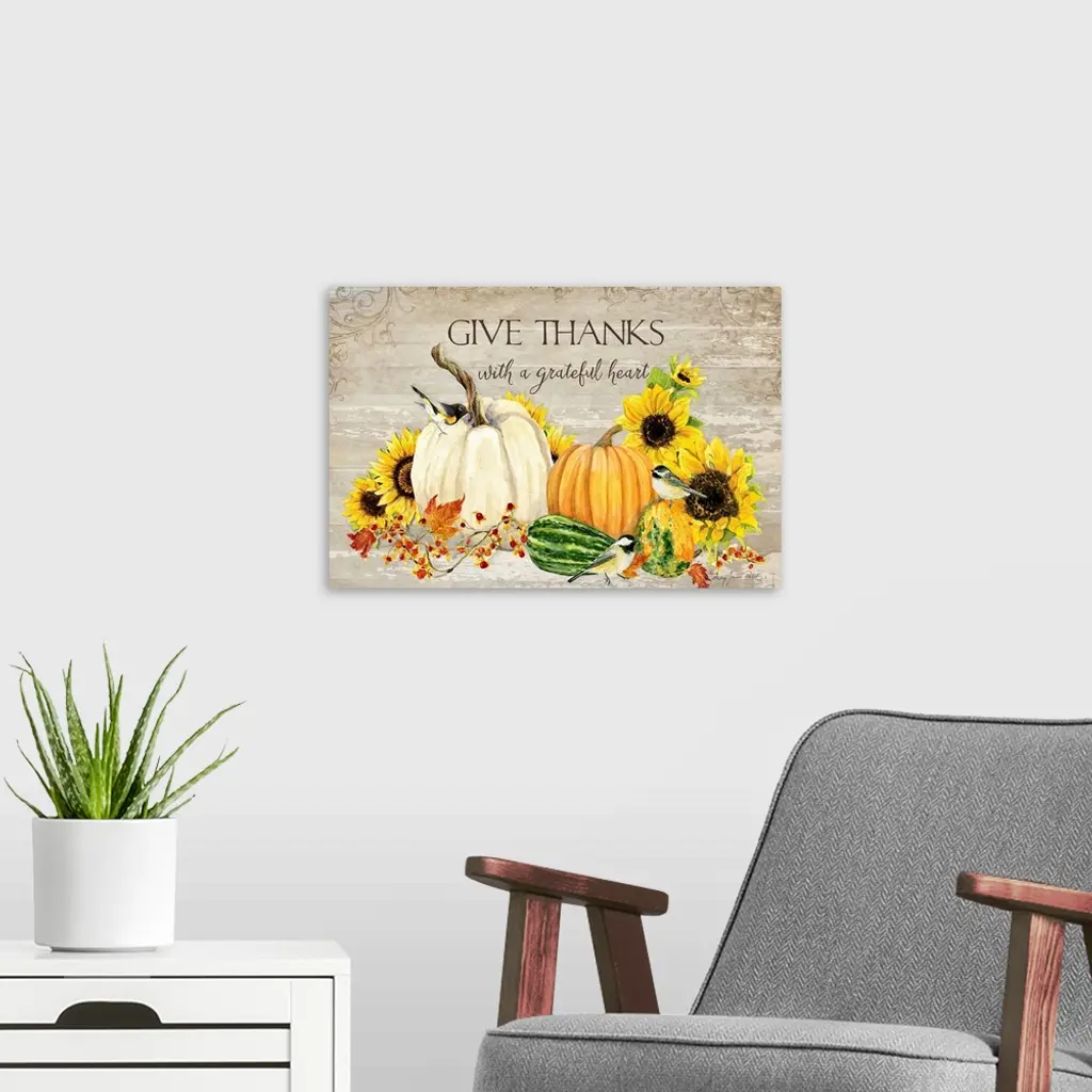 Thanksgiving decor of a white pumpkin, squash, and sunflowers with small birds.