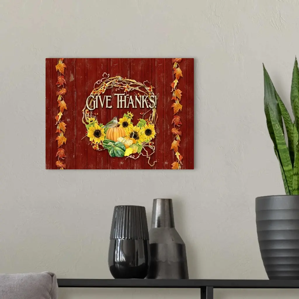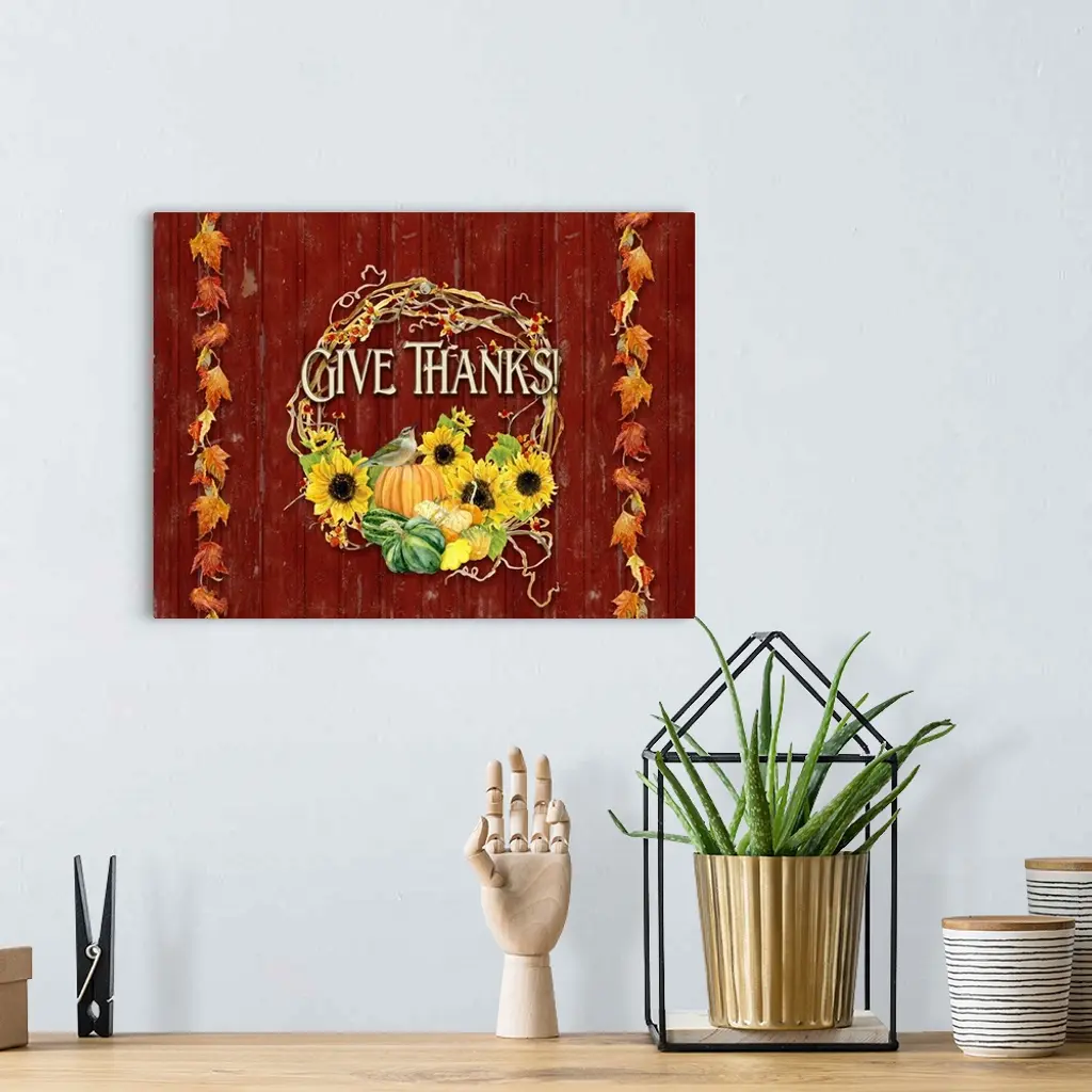 Thanksgiving themed decor of a wreath with sunflowers, squash, and pumpkins.