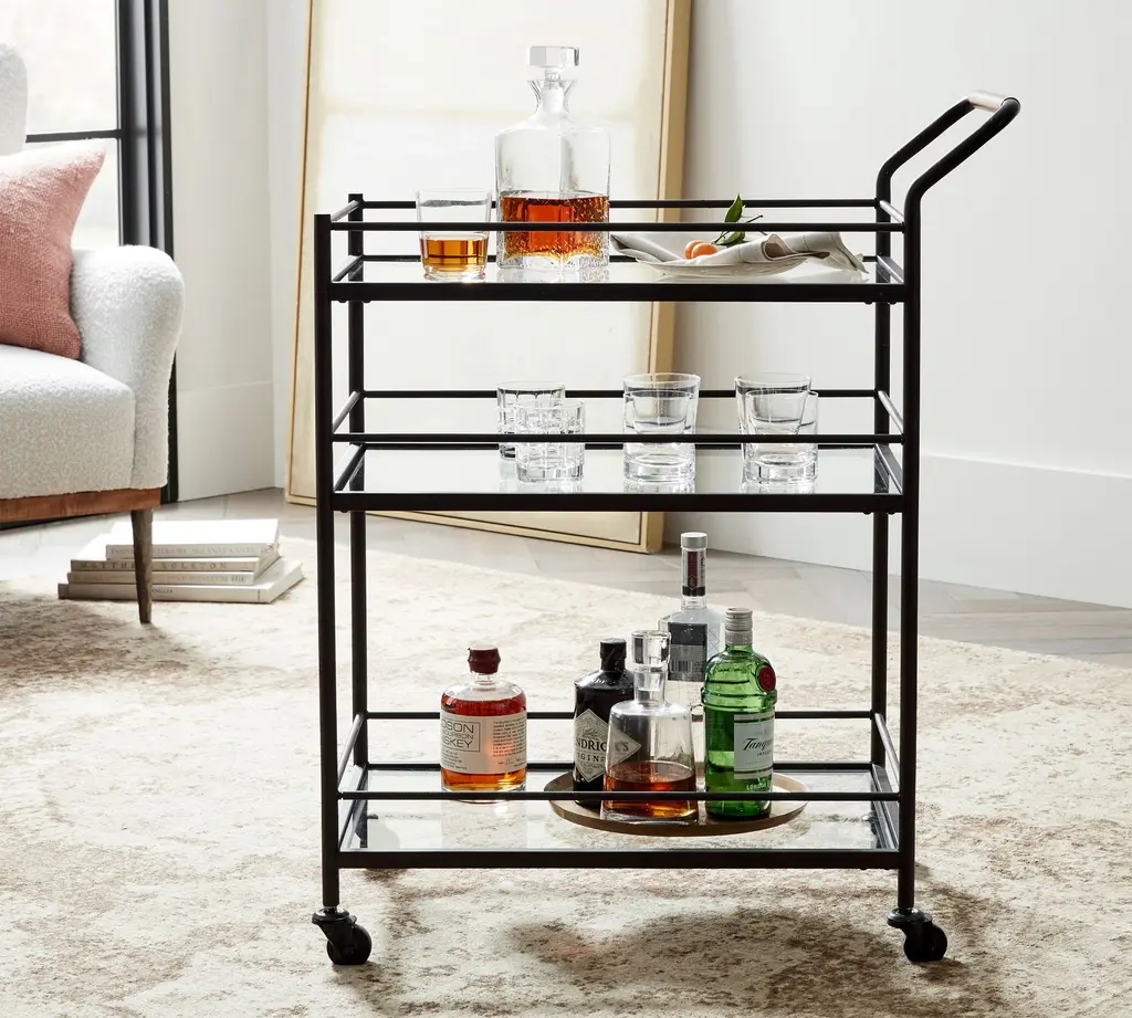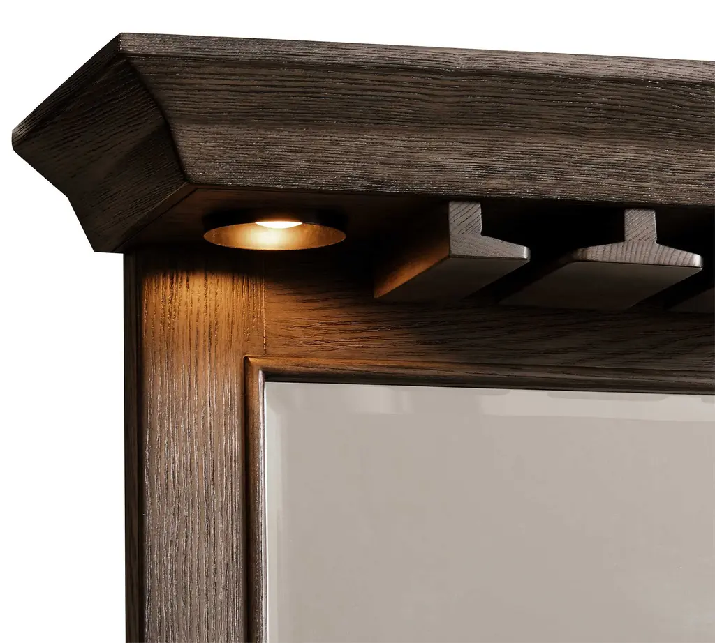 The ultimate home bartender setup. Grand in size and transitional in style, the Bixby Bar Mirror adds to the whole set, creating dimension and opening up the space. The exclusive charcoal finish, which shows off the wood’s intricate grain in a stunning way, matches the entire Bixby Collection – for an entertaining area that’ll be the best spot in town.