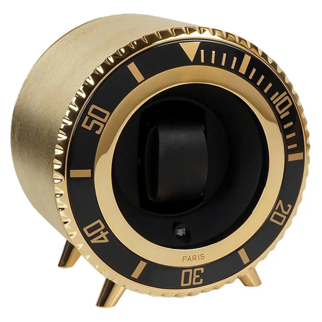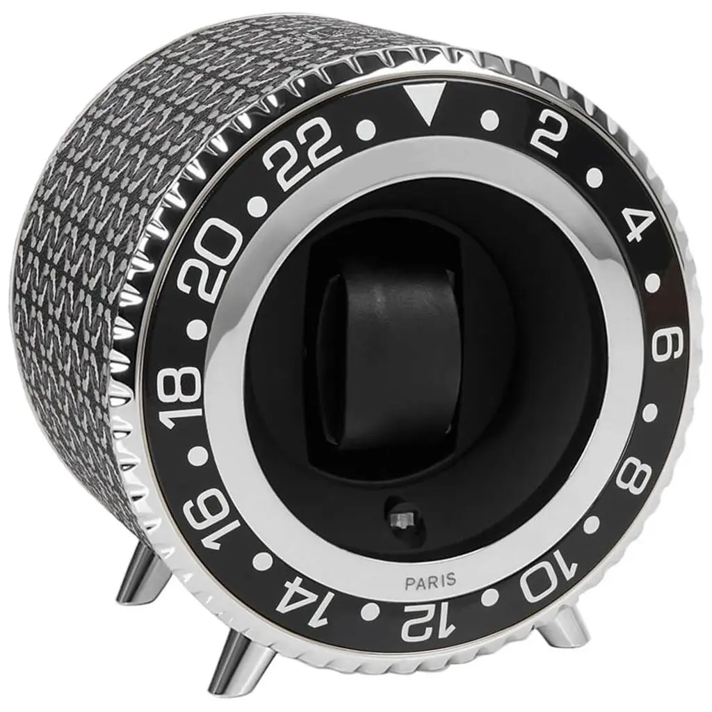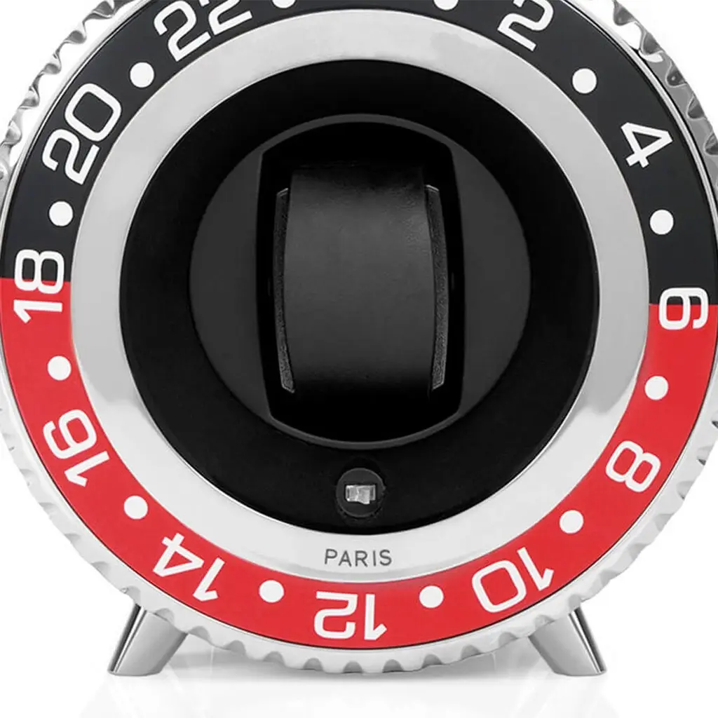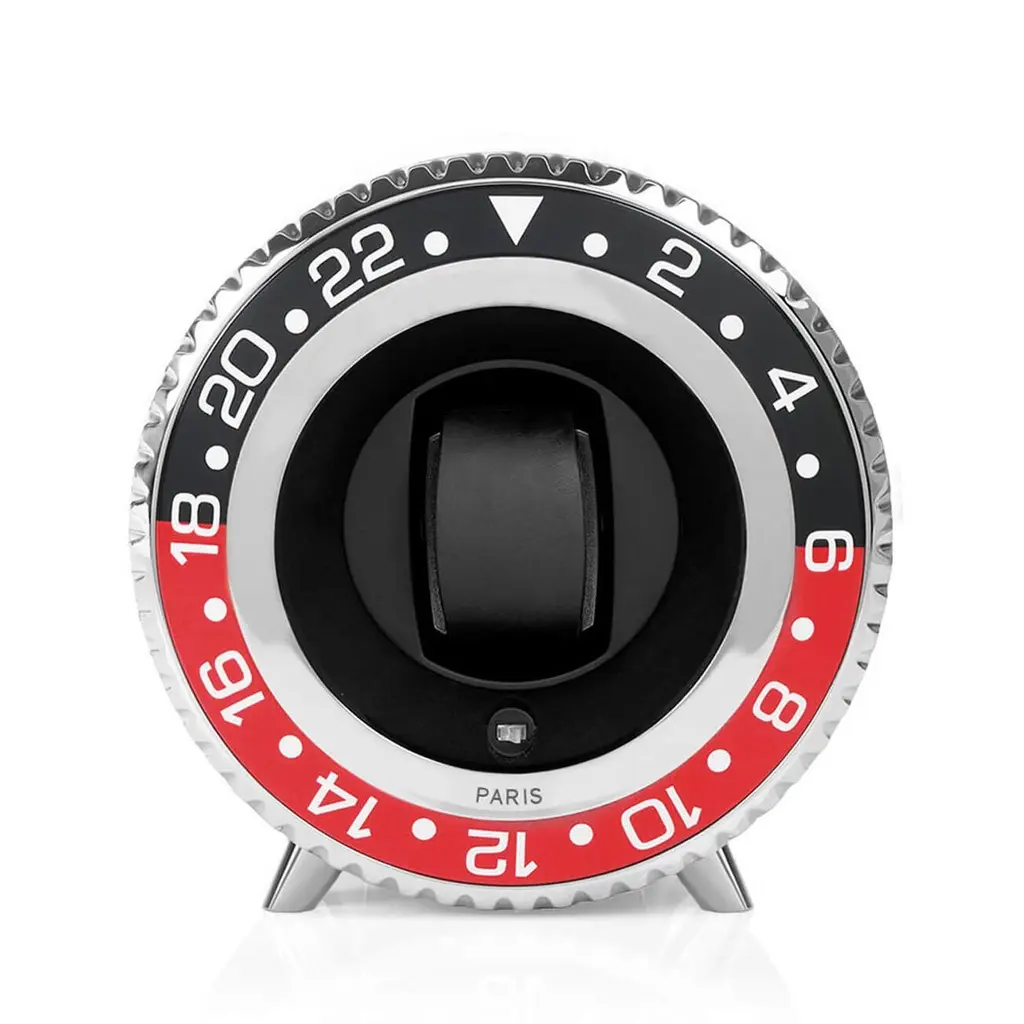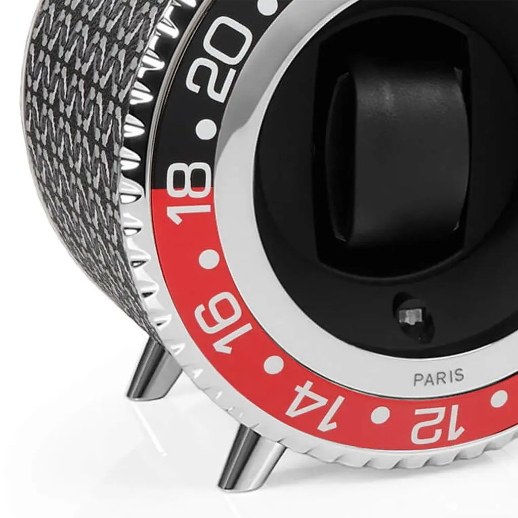 Watch winder black and red notched with bezel in black and red aluminium,structure in aluminium in nickel finish. Rotating small case for automatic watchescovered with notched blackened aluminium in nickel finish. Integrated watchwinder with a cycle of 1600 revolution laps per day with 800 laps in each directionand customizable thanks to an application on your Smartphone.Low power consumption, motor powered by 2 1.5 volt alkaline batteries (LR14).