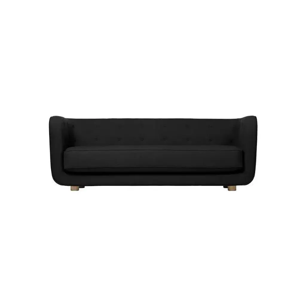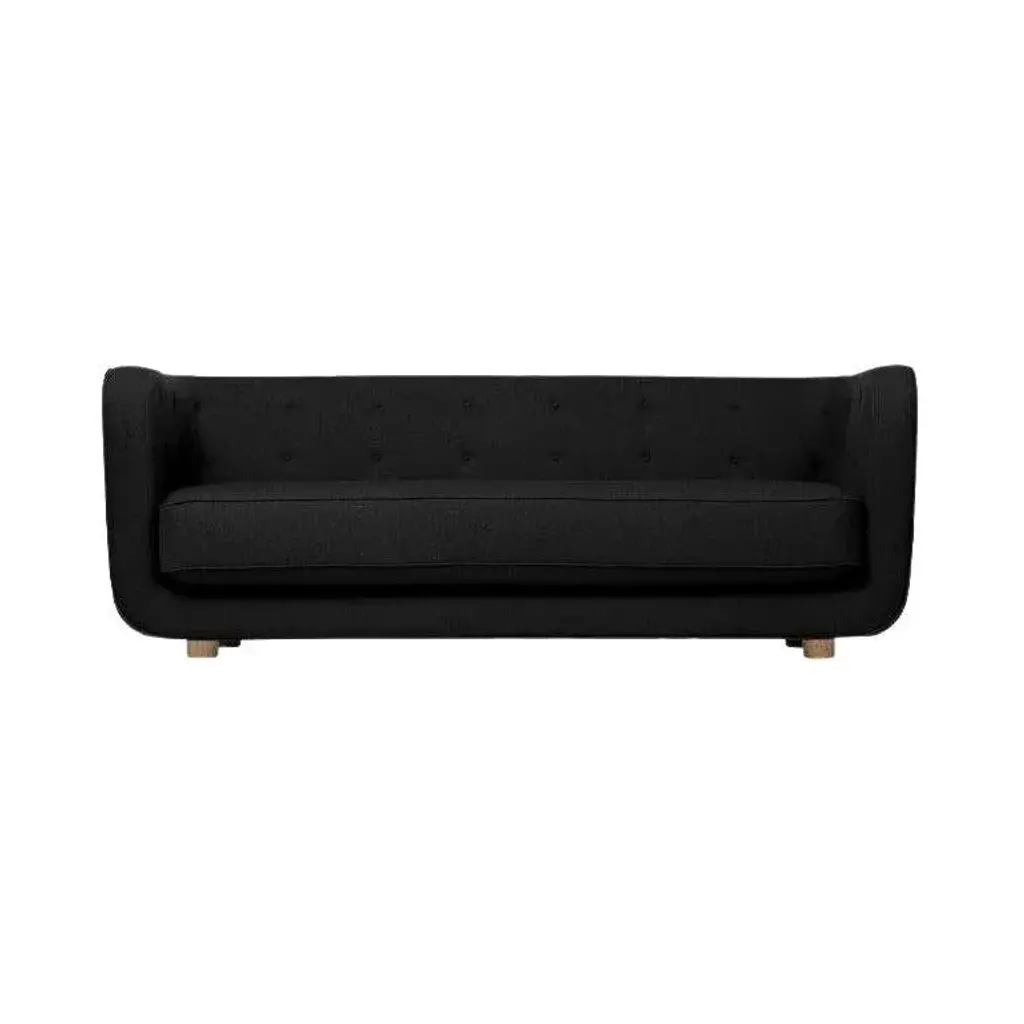 Black and smoked oak raf simons vidar 3 vilhelm sofa by lassen. Dimensions: w 217 x d 88 x h 80 cm materials: textile, oak. Vilhelm is a beautiful padded three-seater sofa designed by flemming lassen in 1935. A sofa must be able to function in several ways. It should invite calm and contemplation. Create a private space you can hide in and at the same time invite to life and play. It must be able to withstand sitting on the backrest or on the armrests and then it must be able to stand in the middle of the room if you want to. In addition to being aesthetically beautiful and harmonious, the design makes absolute sense in relation to these parameters. By lassen is a danish design brand focused on iconic designs created by mogens and flemming lassen, founded by lassens’ relatives in 2008.