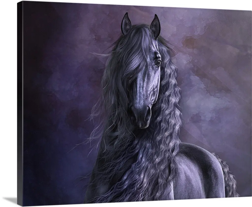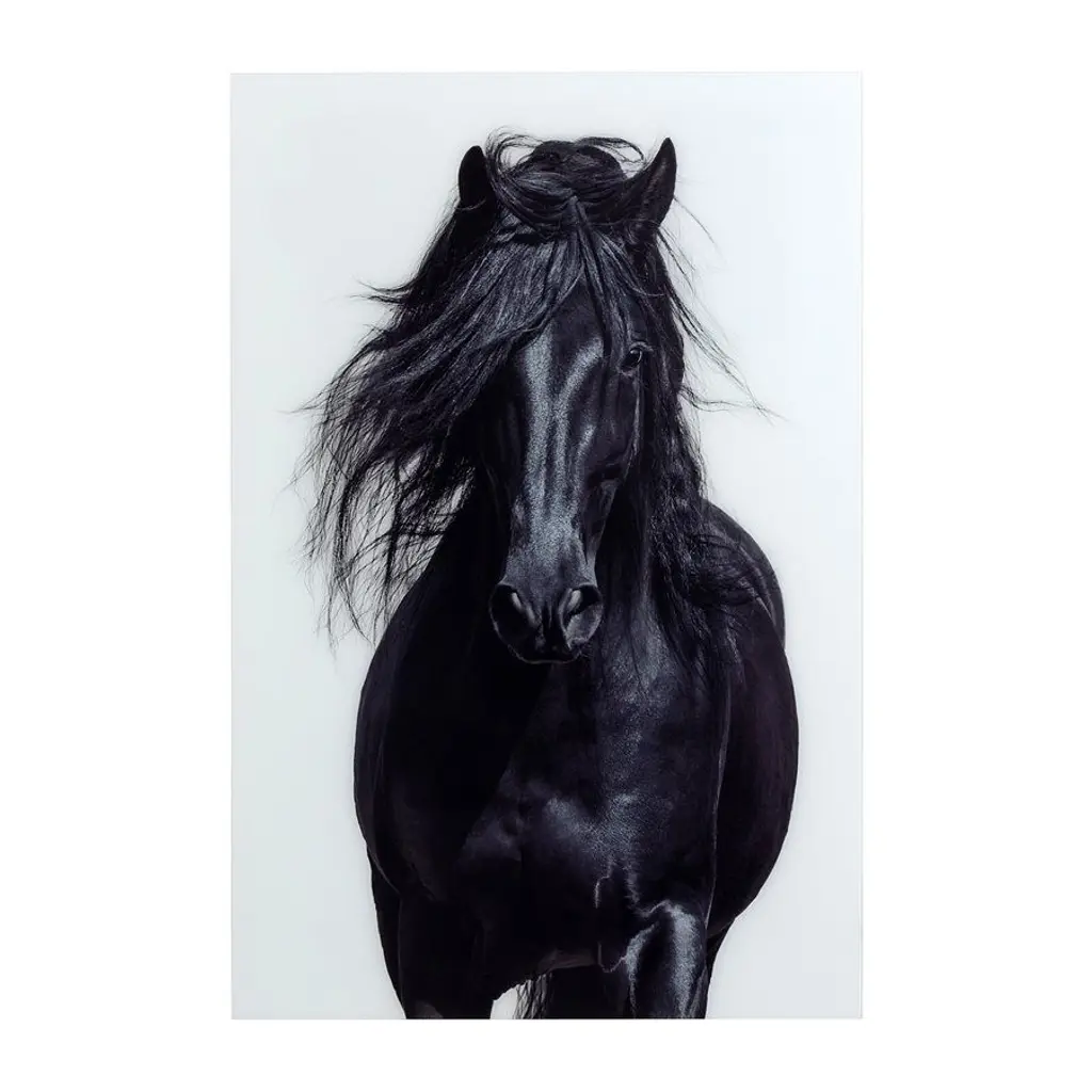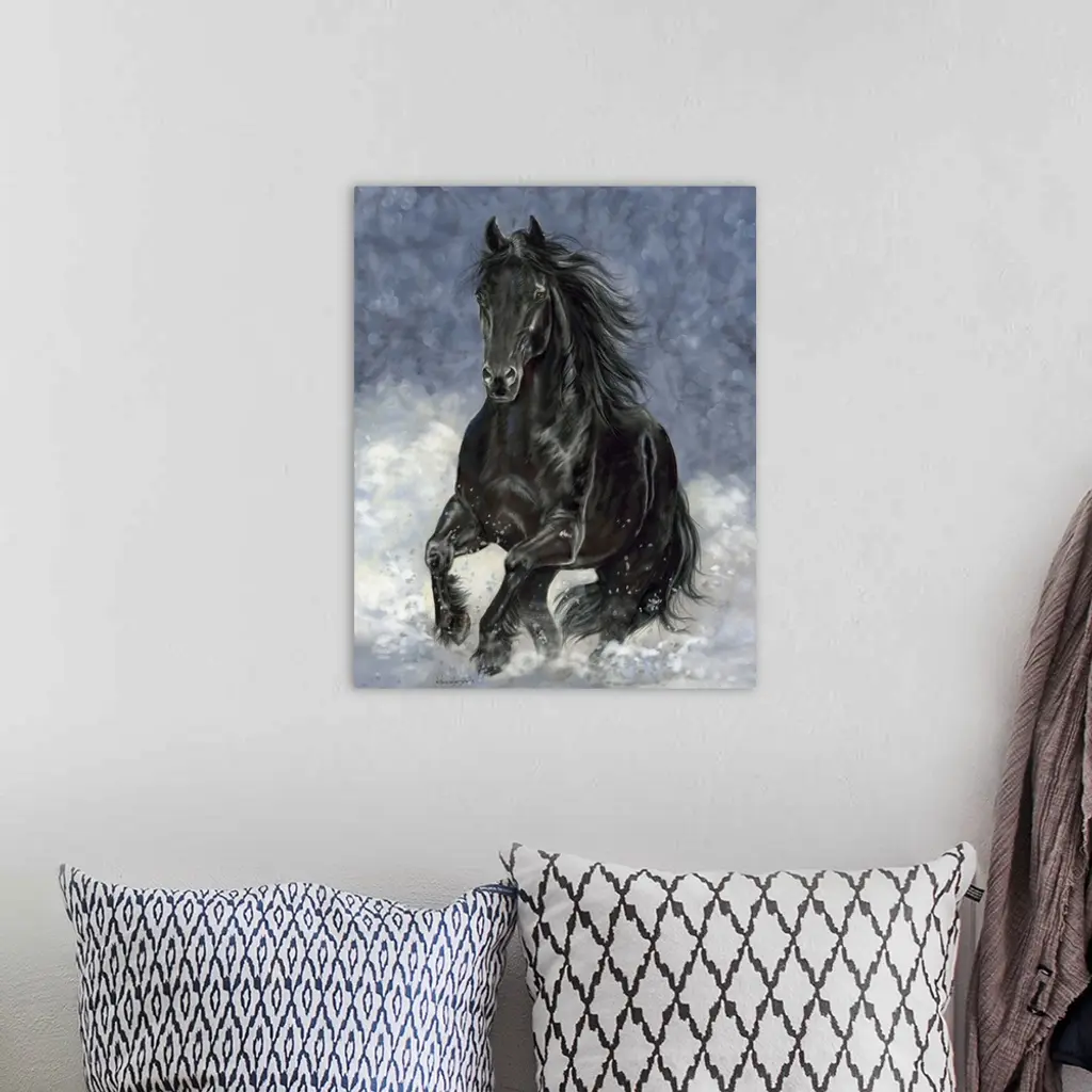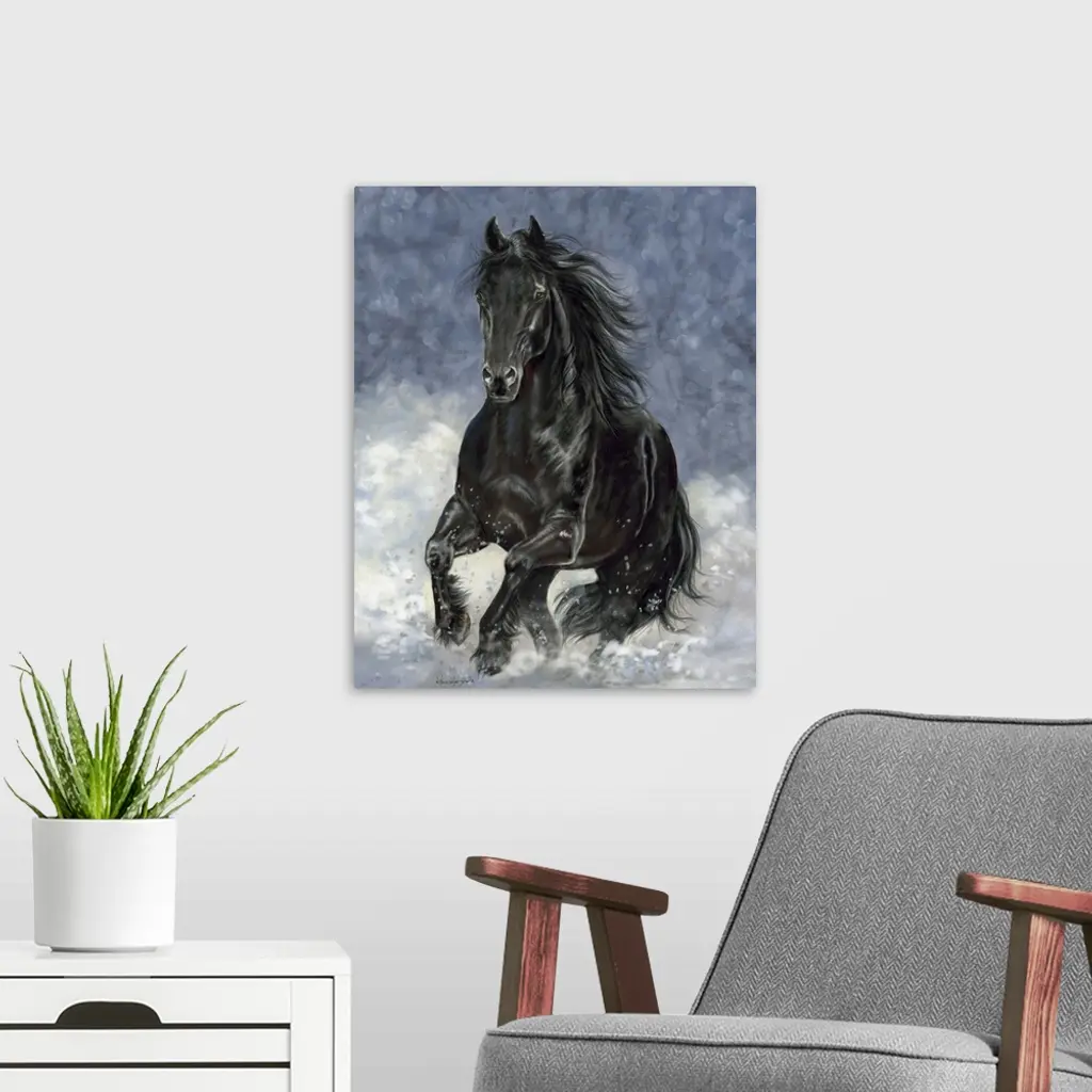 A large black horse galloping through the snow.
