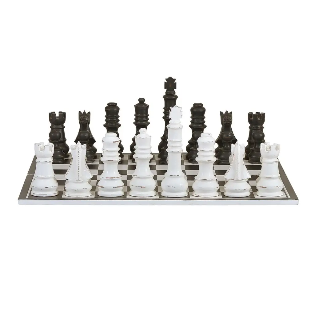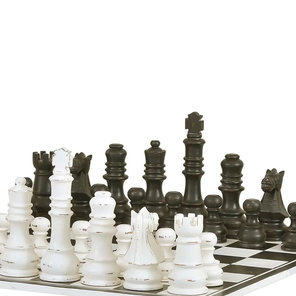 This exquisite piece combines timeless design influenced by the European countryside. Featuring a hand-painted lightly distressed black and white harvest painted finish. The chessboard itself is meticulously crafted, with a classic black and white checkered pattern that sets the stage for intense and strategic play.The set includes intricately designed chess pieces, finished in matching black and white to enhance visual appeal and ease of play. Whether displayed as a decorative piece or used for regular play, this chess set adds a touch of elegance and sophistication to your living space.Dimensions: 31" W x 31" D x 10.5" HCustom finish options are also available. Contact us to learn more.