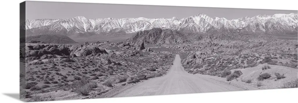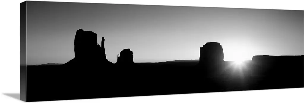 Black and white panoramic view of rock formations in Monument Valley, Utah.