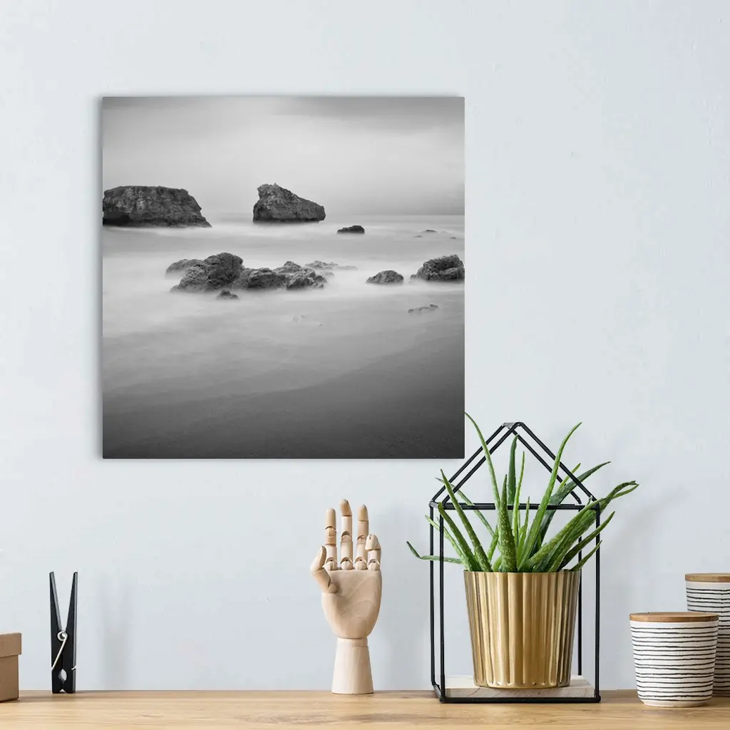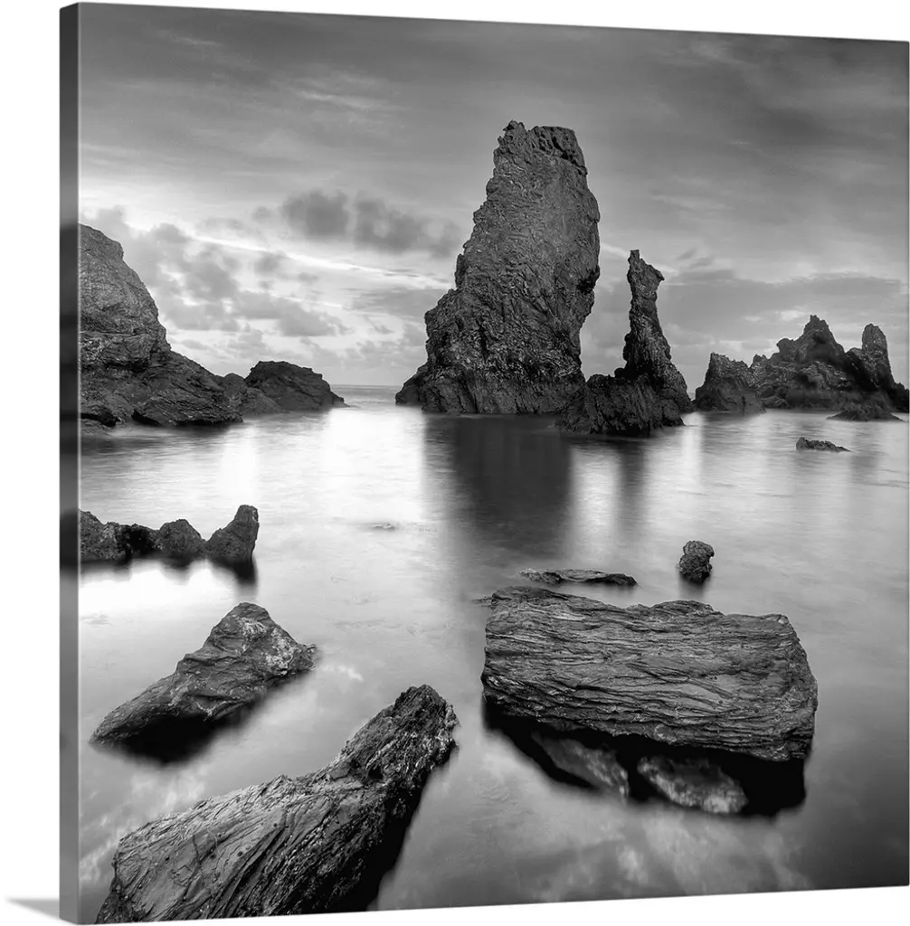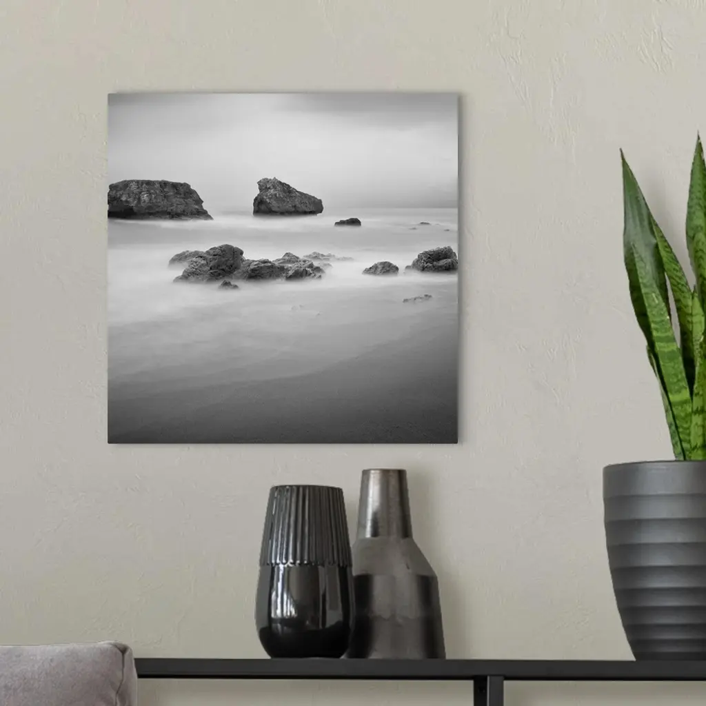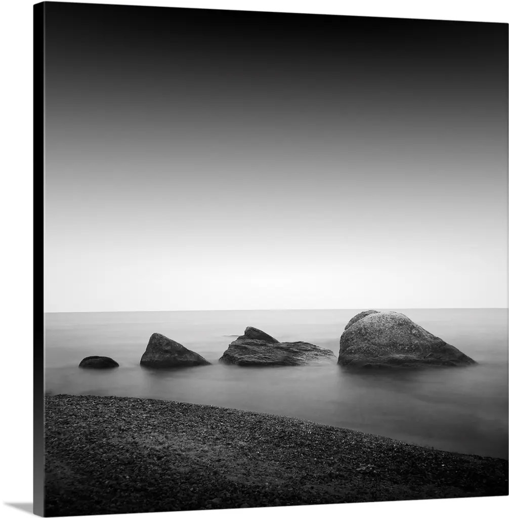 Black and White image of rocks in the ocean near a sandy beach. wall art for home and office decor. Discover canvas art prints, photos, mural, big canvas art and framed wall art in GreatBigCanvas.com's varied collections.