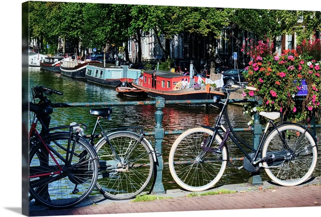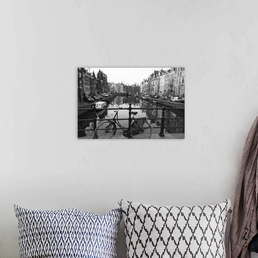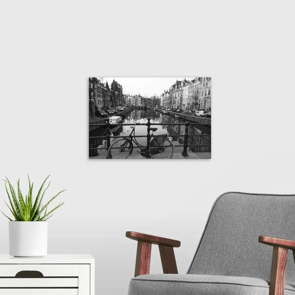 Black and white imge of an old bicycle by the Singel canal, Amsterdam, Netherlands wall art for home and office decor. Discover canvas art prints, photos, mural, big canvas art and framed wall art in GreatBigCanvas.com's varied collections.