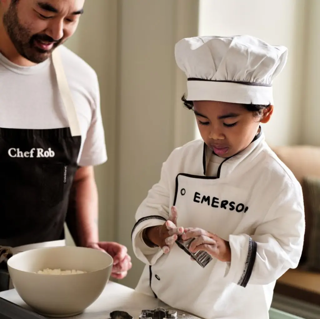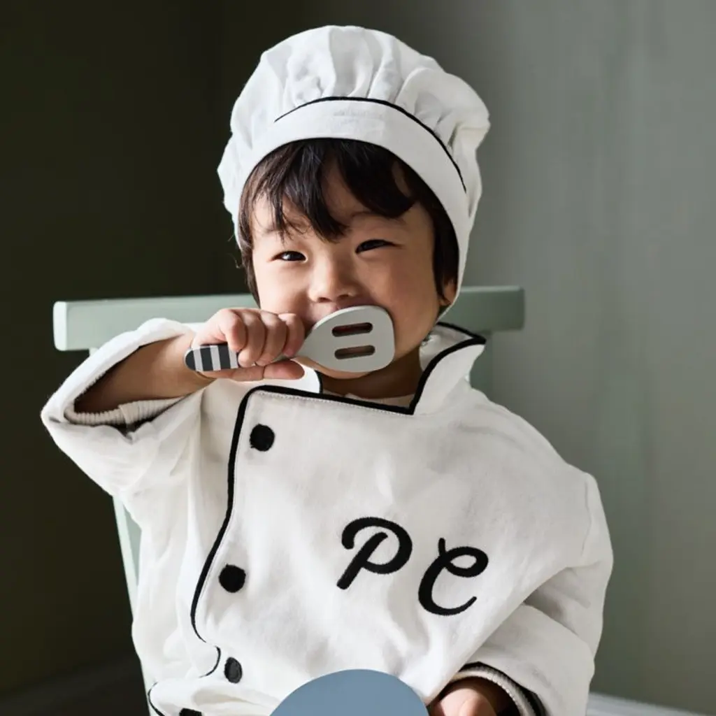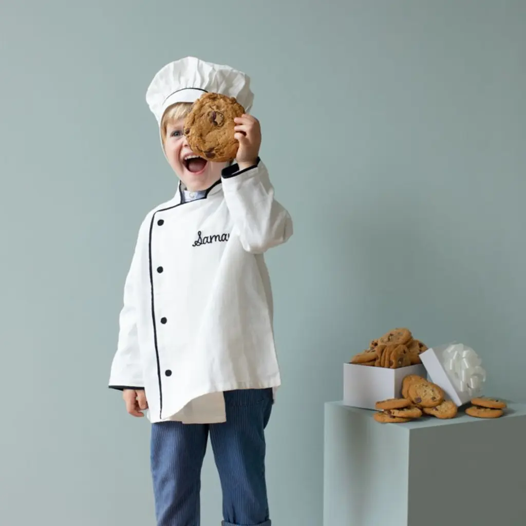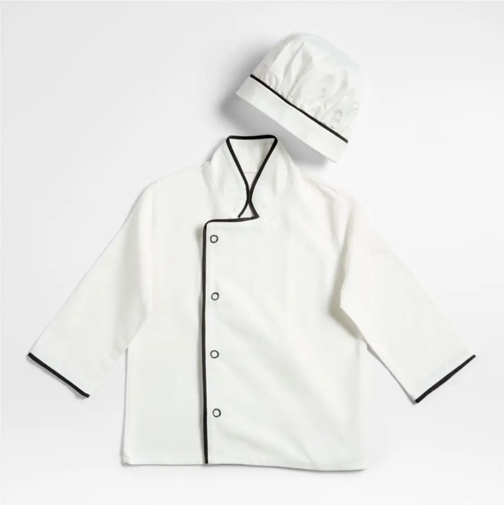 Whether your child's playing an imaginary game of "restaurant" or rolling out cookie dough, this chef coat and hat set will make them feel like a pro. Made of organic cotton with contrasting trim and an optional monogram, it's a crisp replica of a traditional chef's uniformjust shrunken down to an adorably small size.
