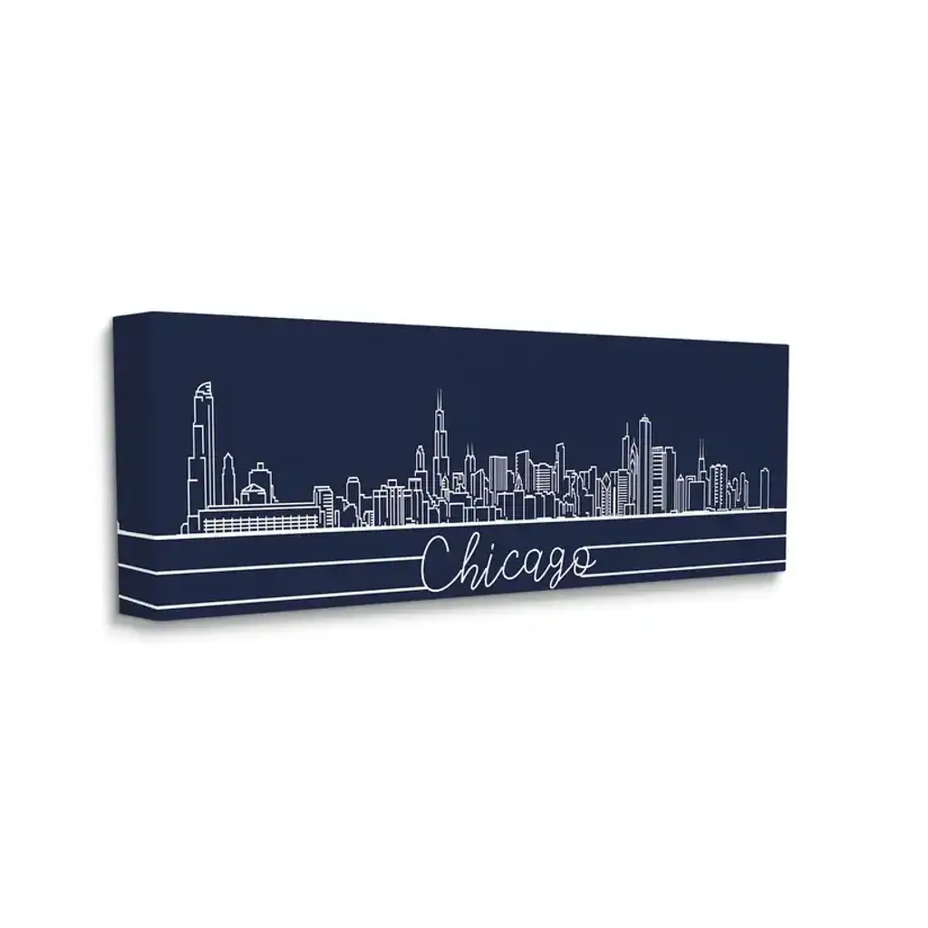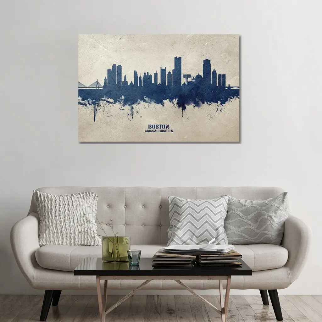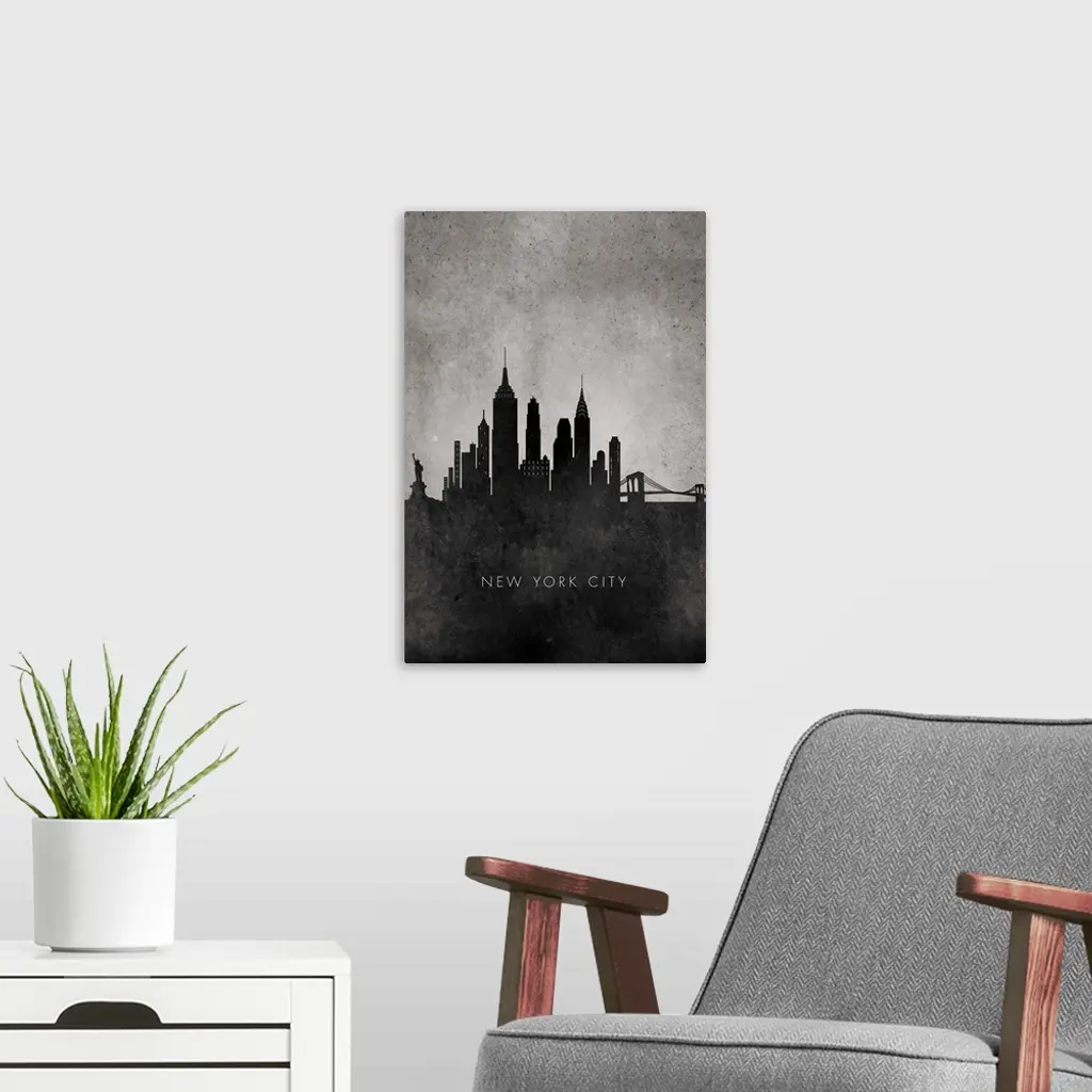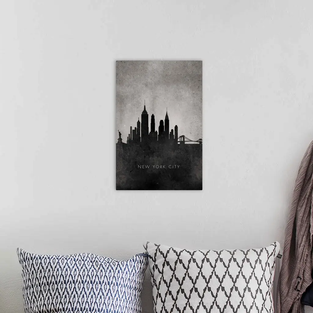 Vertical oversized art of a digitally rendered, minimalist silhouette of the New York City skyline, surrounded by cloudy and speckled background.