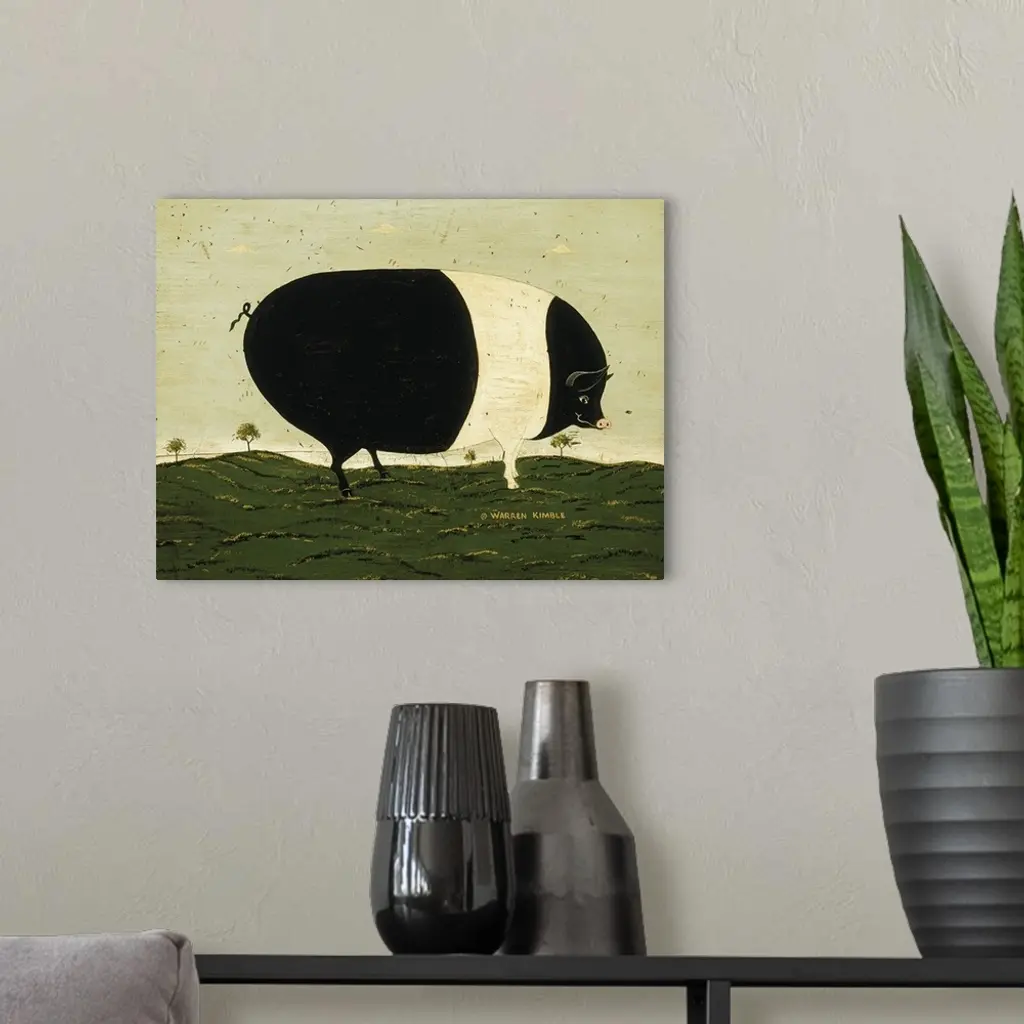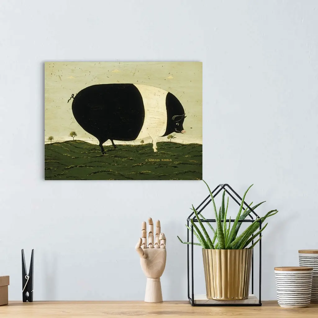 Americana farm animal scene by a renowned folk artist. A huge striped pig is grazing in a meadow with small trees in the distance.