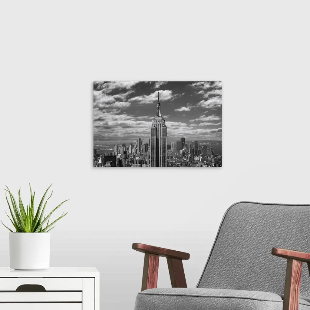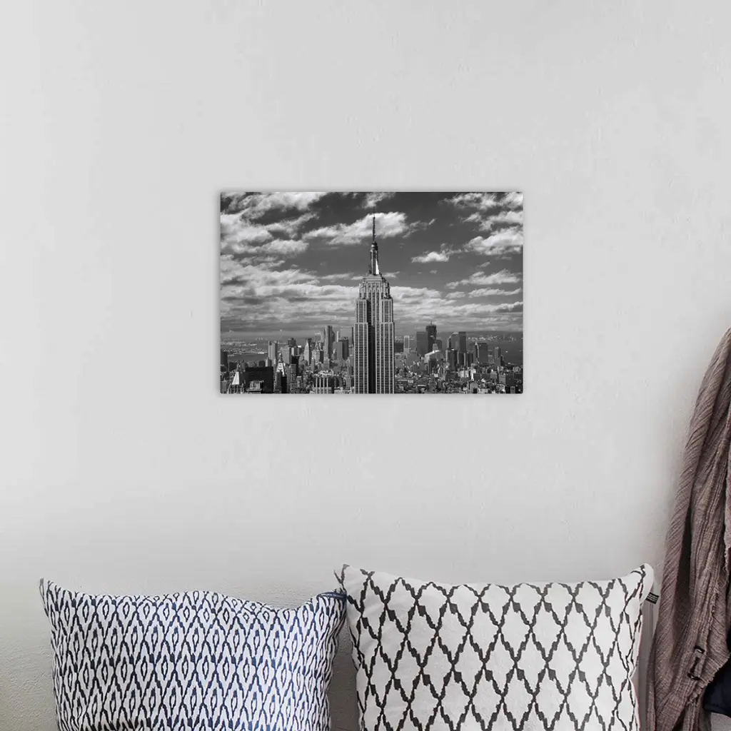 Black and white landscape photograph taken of the Empire State building with the skyline seen in the background.