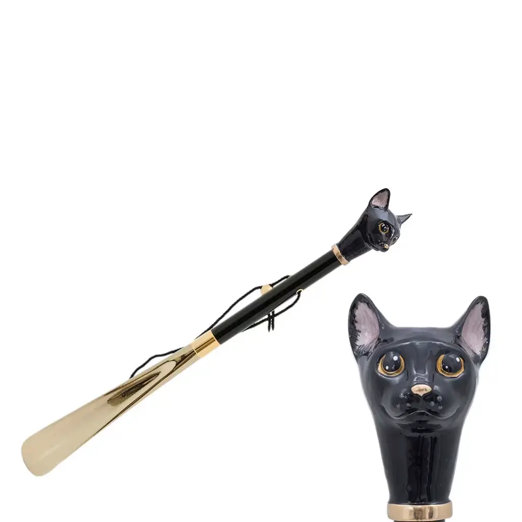 Unique and sophisticated, the Black Cat Shoehorn is a stylish accessory featuring an enameled brass handle in the form of a black cat head, a wooden shaft and an ABS end. Entirely handmade in Italy it measures 50 cm in length.