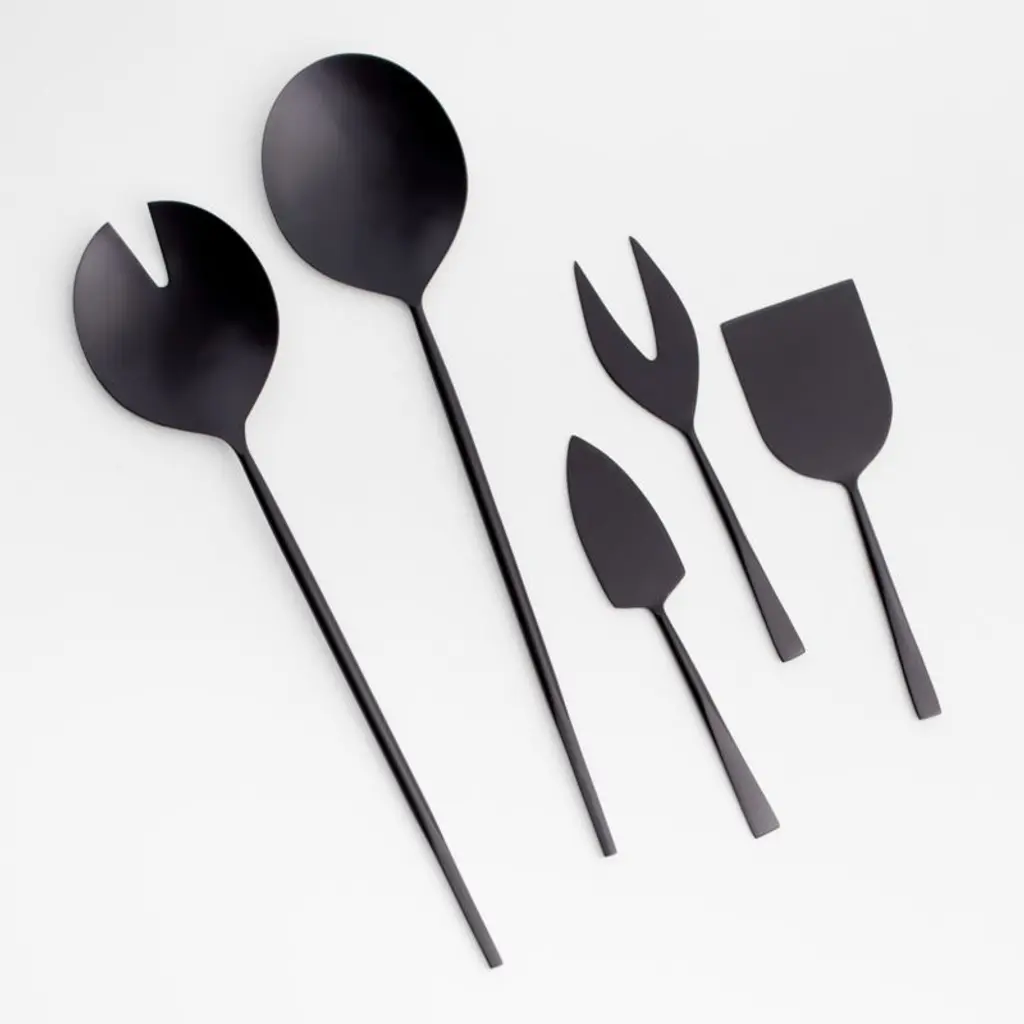 Bring some dark drama to your cheeseboard with our set of three black cheese knives.With their flattened handles and matte black finish, the stainless steel knives elevate any cheese-serving occasion, from a refined cocktail hour to a late-night snack. Use the wide knife to divide soft cheeses such as brie, the narrow plane knife to portion wedges of semi-hard cheeses such as Gouda, and the pronged knife to easily pierce hard cheeses such as Parmesan. To complete the look, pair the exclusive set with any of our black flatware and serving utensils.