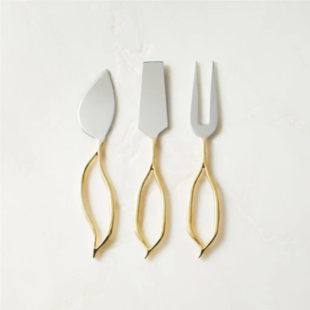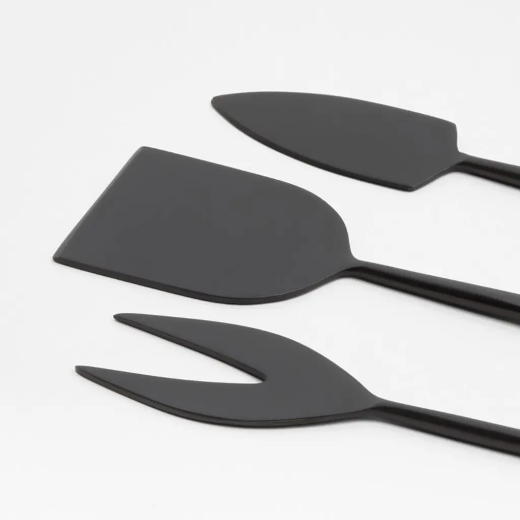 Bring some dark drama to your cheeseboard with our set of three black cheese knives.With their flattened handles and matte black finish, the stainless steel knives elevate any cheese-serving occasion, from a refined cocktail hour to a late-night snack. Use the wide knife to divide soft cheeses such as brie, the narrow plane knife to portion wedges of semi-hard cheeses such as Gouda, and the pronged knife to easily pierce hard cheeses such as Parmesan. To complete the look, pair the exclusive set with any of our black flatware and serving utensils.