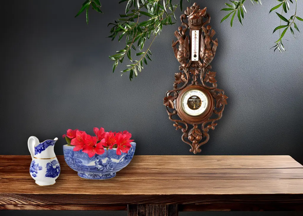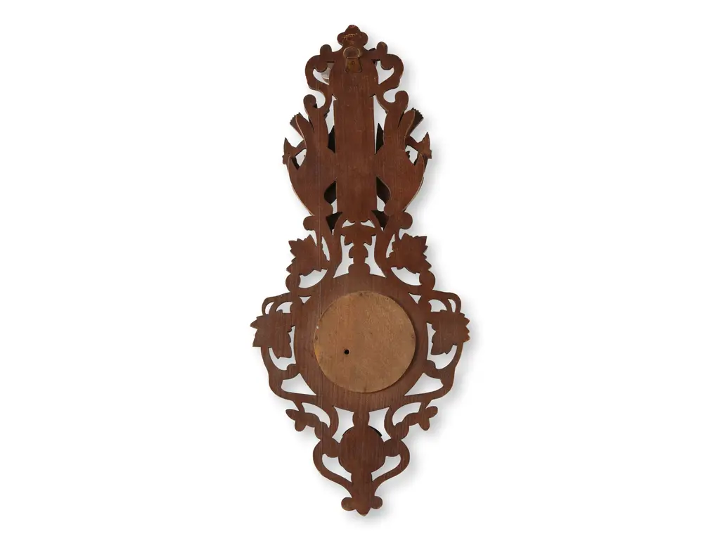 This large antique Black Forest barometer features masterful hand-carved details, showcasing the artistry of traditional Black Forest craftsmanship. Adorned with a large, intricately carved fox and birds, it captures the beauty of wildlife in rich, dimensional woodwork. A rare find, captivating wall accent, perfect for collectors of fine woodwork and nature-inspired decor.