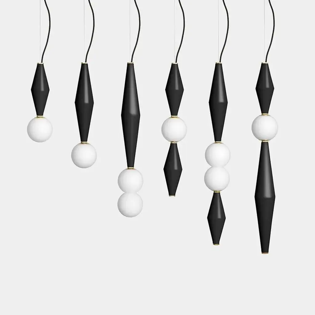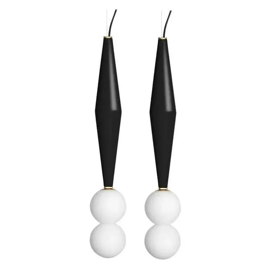 Pair of black gamma C lamp by Mason Editions Dimensions: 12 × 12 × 37 cm. Materials: aluminium and blown opal white glass. Colours: pink, burgundy, light grey, sage green, petrol green, black. All our lamps can be wired according to each country. Gamma is the third letter of the Greek alphabet and also the third brightest star in the constellation. It’s in fact an alphabet of three aluminium elements, that creates a range of six modular suspensions. The frosted glass spheres contain the luminous soul which, combined in different ways with the metal elements, give life to new solutions that look like constellations. Pendant light fixture with an elegant but bold Silhouette. Hang it to the ceiling at different heights with other Gamma pendants to create a scenographic luminous composition. Up to 250V (Europe/UK Standard).