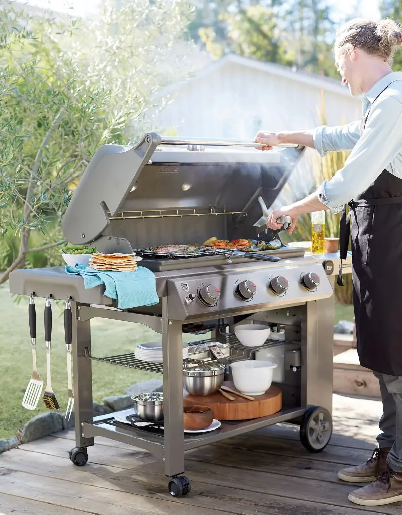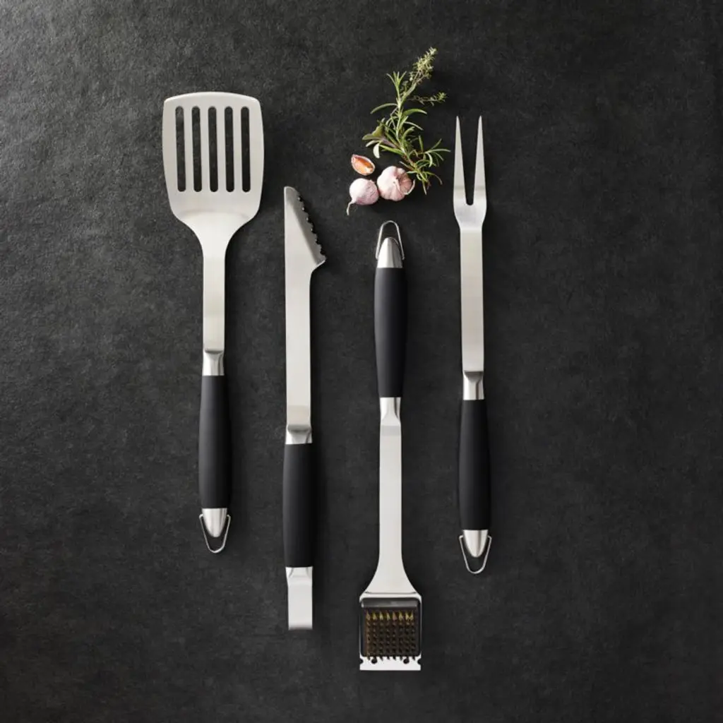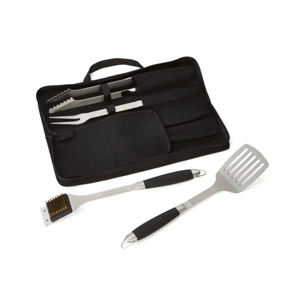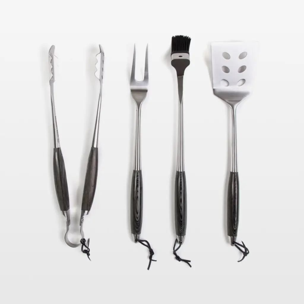 For the grill-master on the go, our set of sturdy, heavy-gauge stainless steel grill essentials comes packed in a black carrying case. Black-handled tools include a turner, fork, tongs and grill brush.
