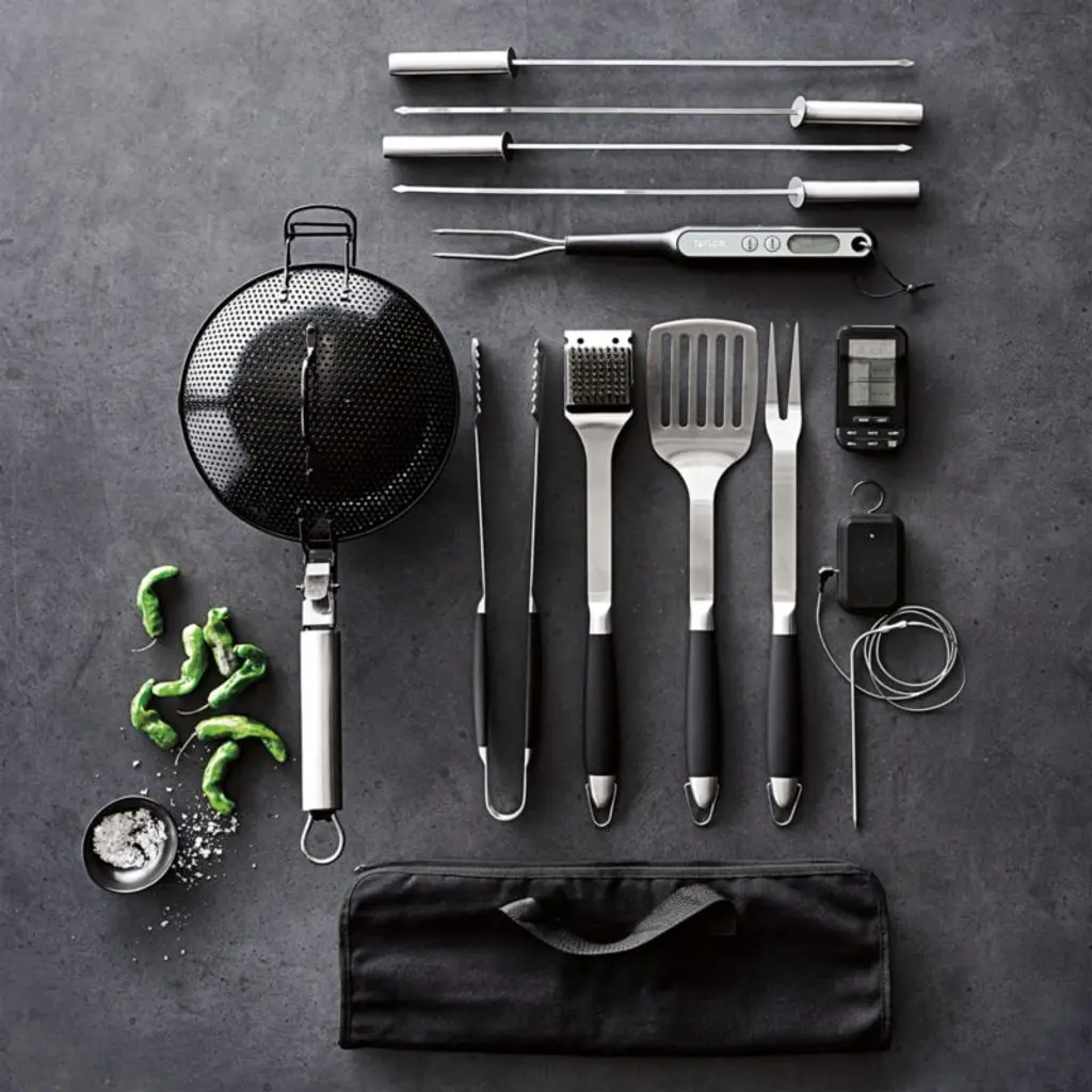 For the grill-master on the go, our set of sturdy, heavy-gauge stainless steel grill essentials comes packed in a black carrying case. Black-handled tools include a turner, fork, tongs and grill brush.