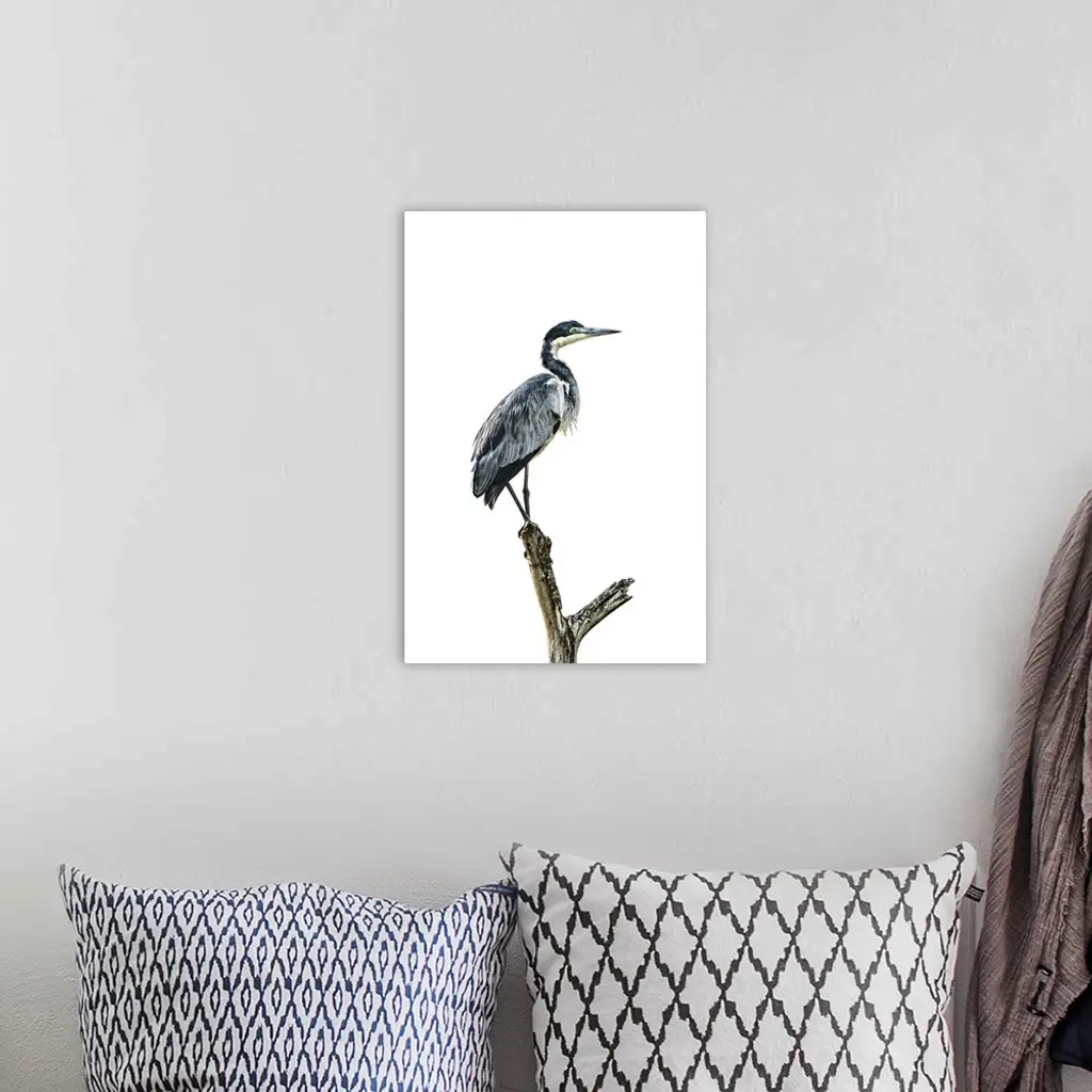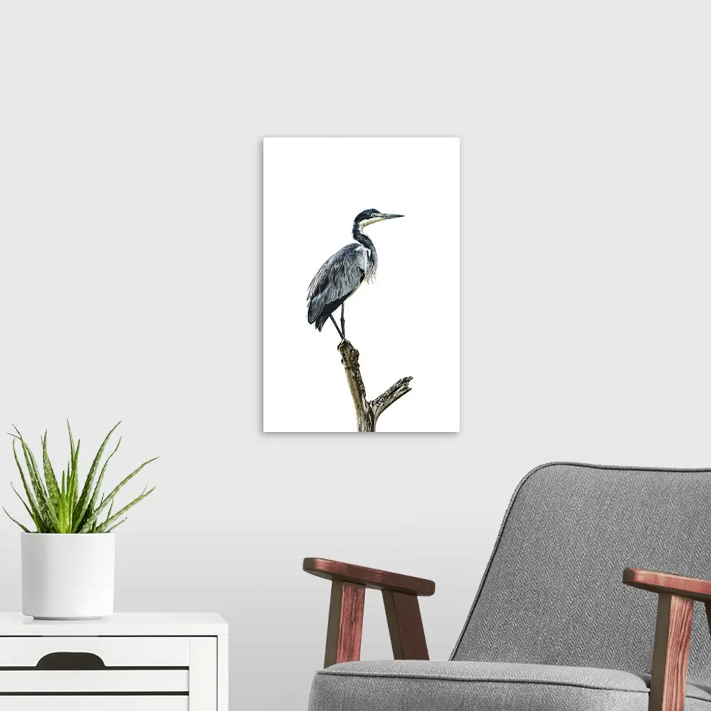 Black-headed heron (Ardea melanocephala) stands in profile on a forked tree stump against a cloudy, white sky. It has black and yellow eyes, a black-and-white head, grey beak and a mixture of black, white and grey feathers. Taken in Serengeti National Park; Tanzania