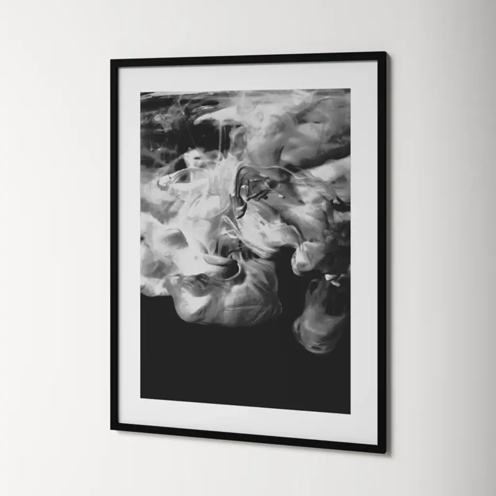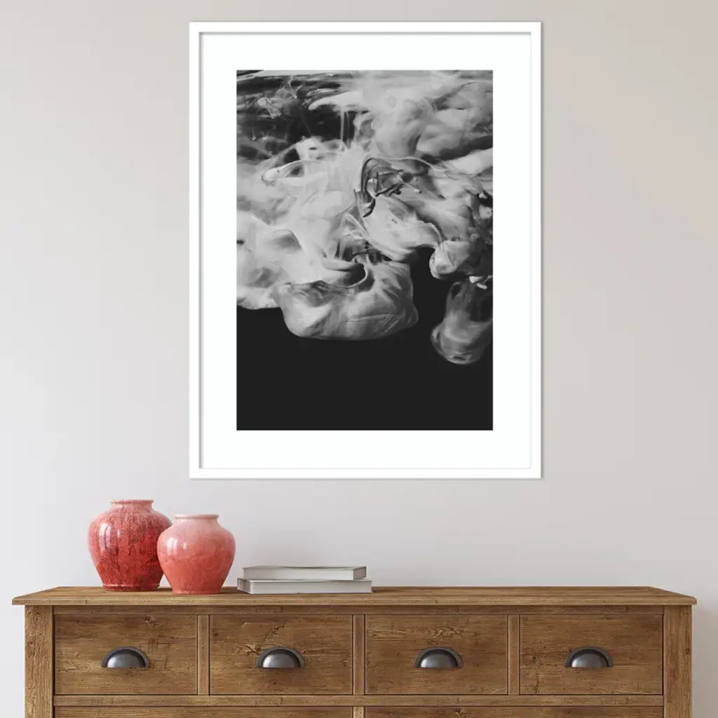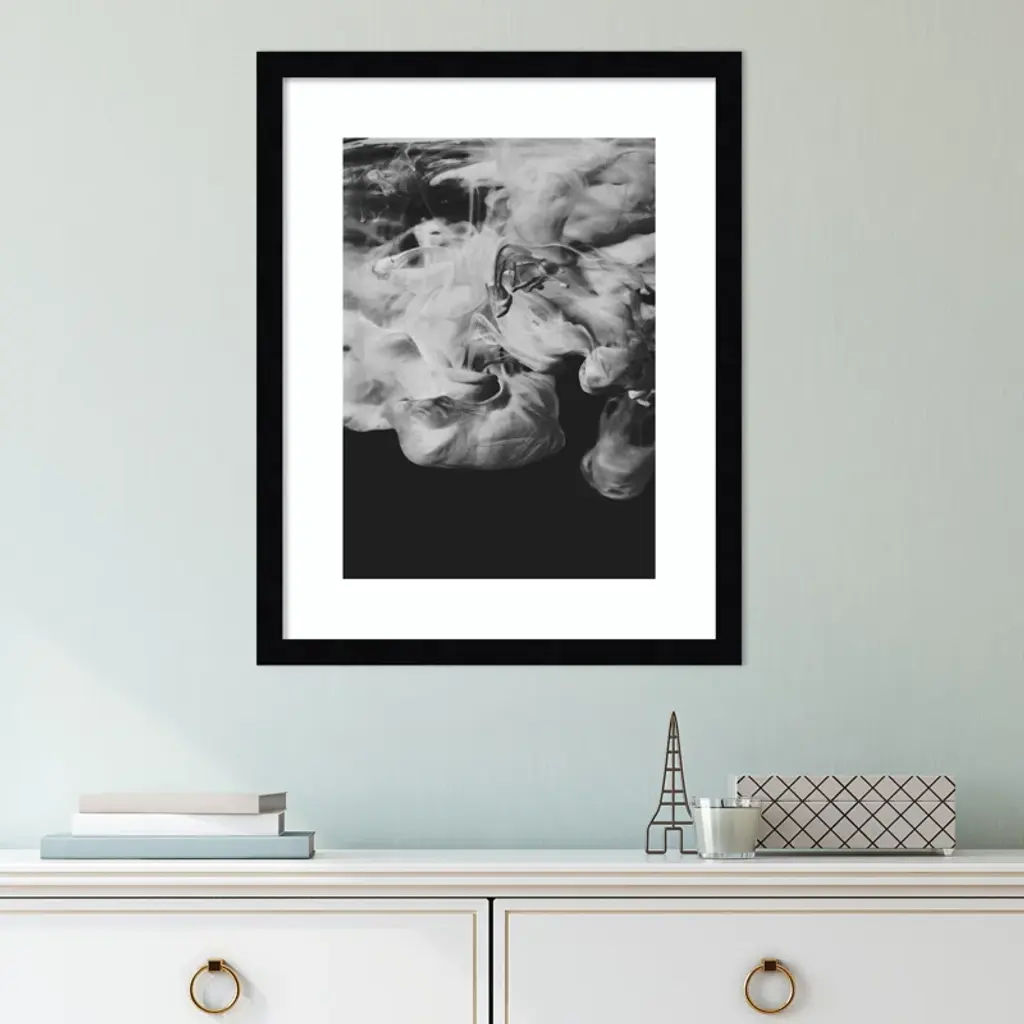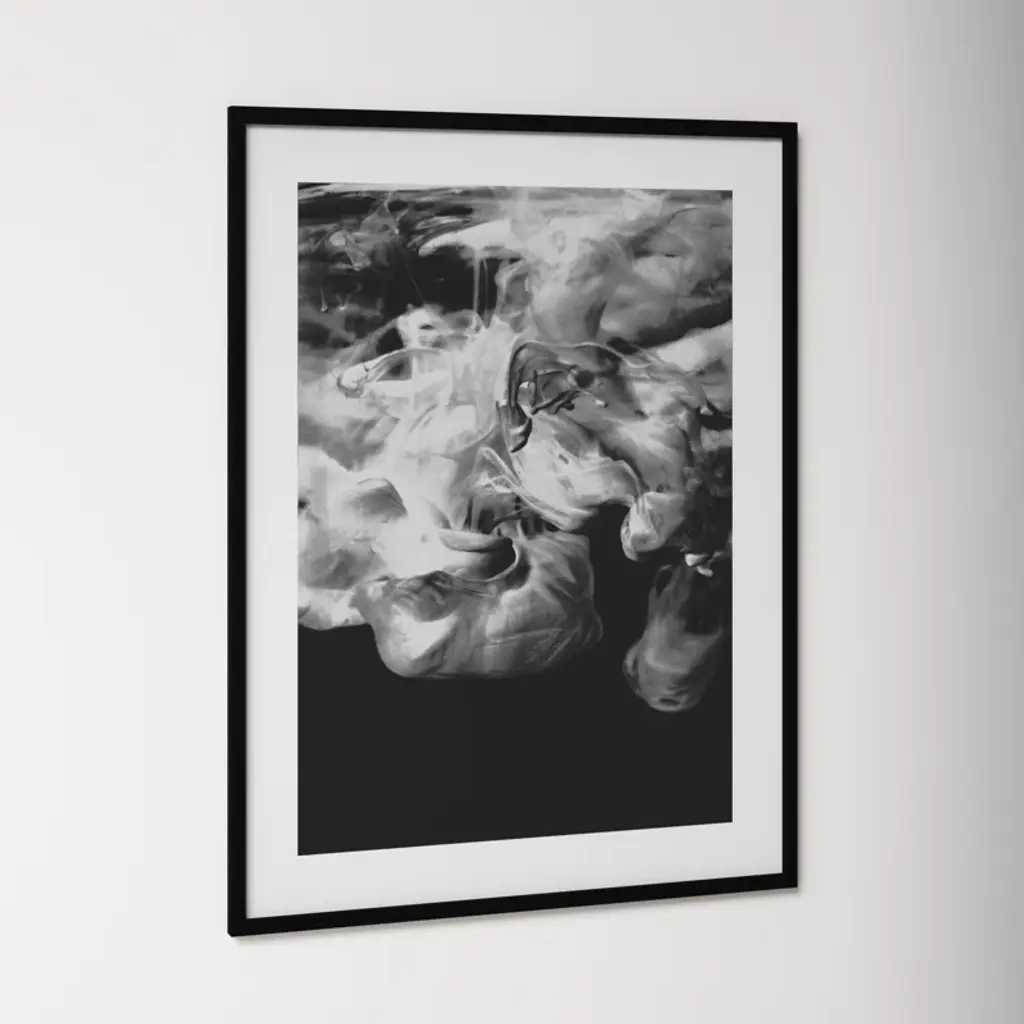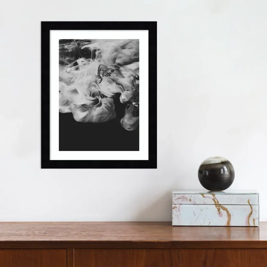 Freeze-frame. Capturing a split-second swirl of ink in water, this black-and-white photographic print invites a moment of stillness – and a closer look. It’s printed on premium paper with fade-resistant inks, mounted to a rigid backer, and framed in solid wood with a gallery-quality acrylic cover. Ready to hang.