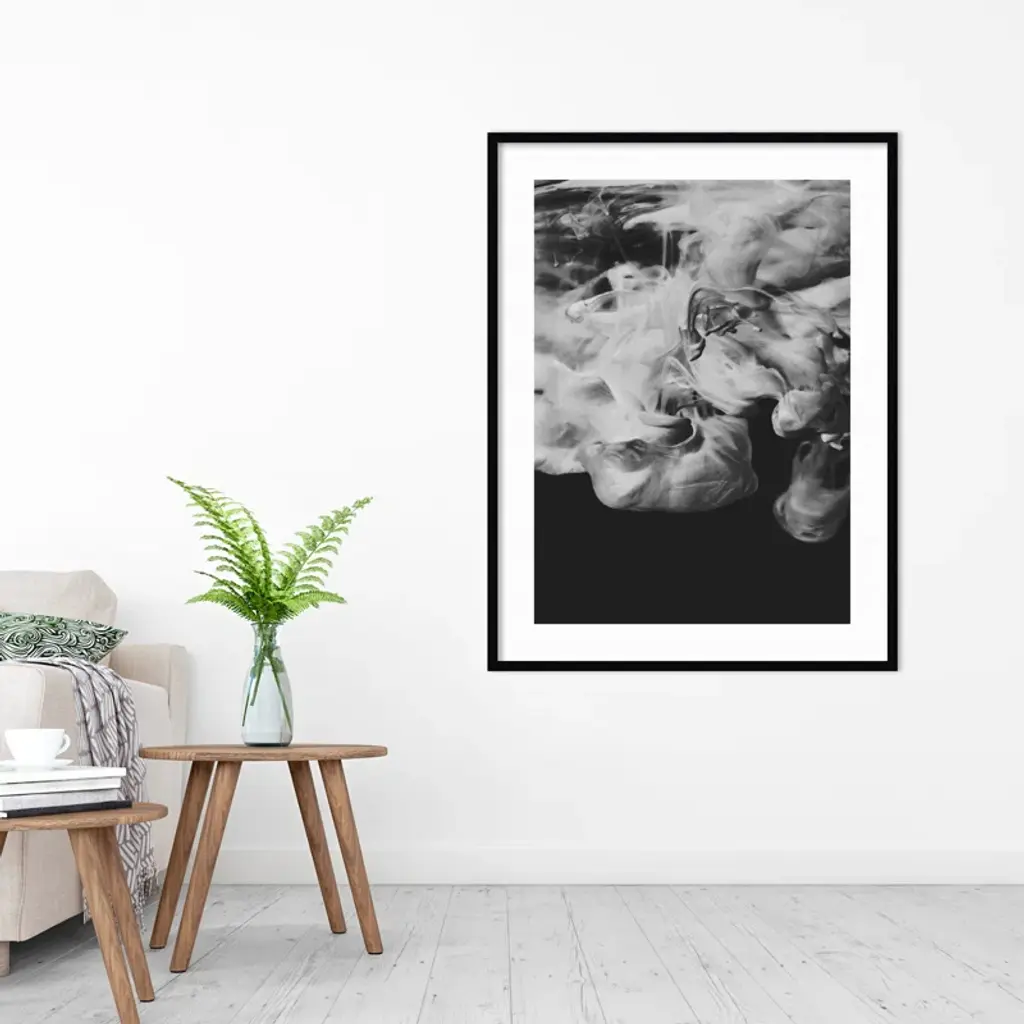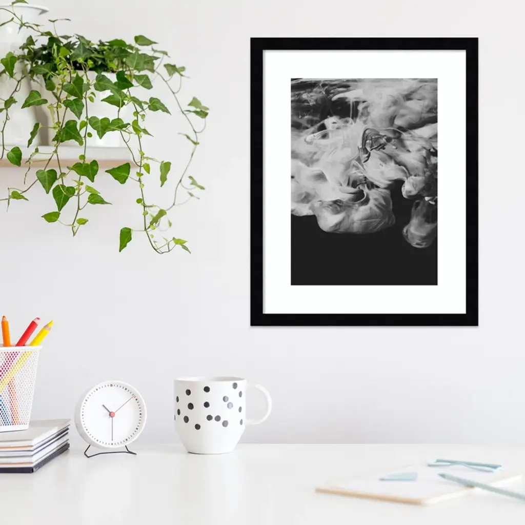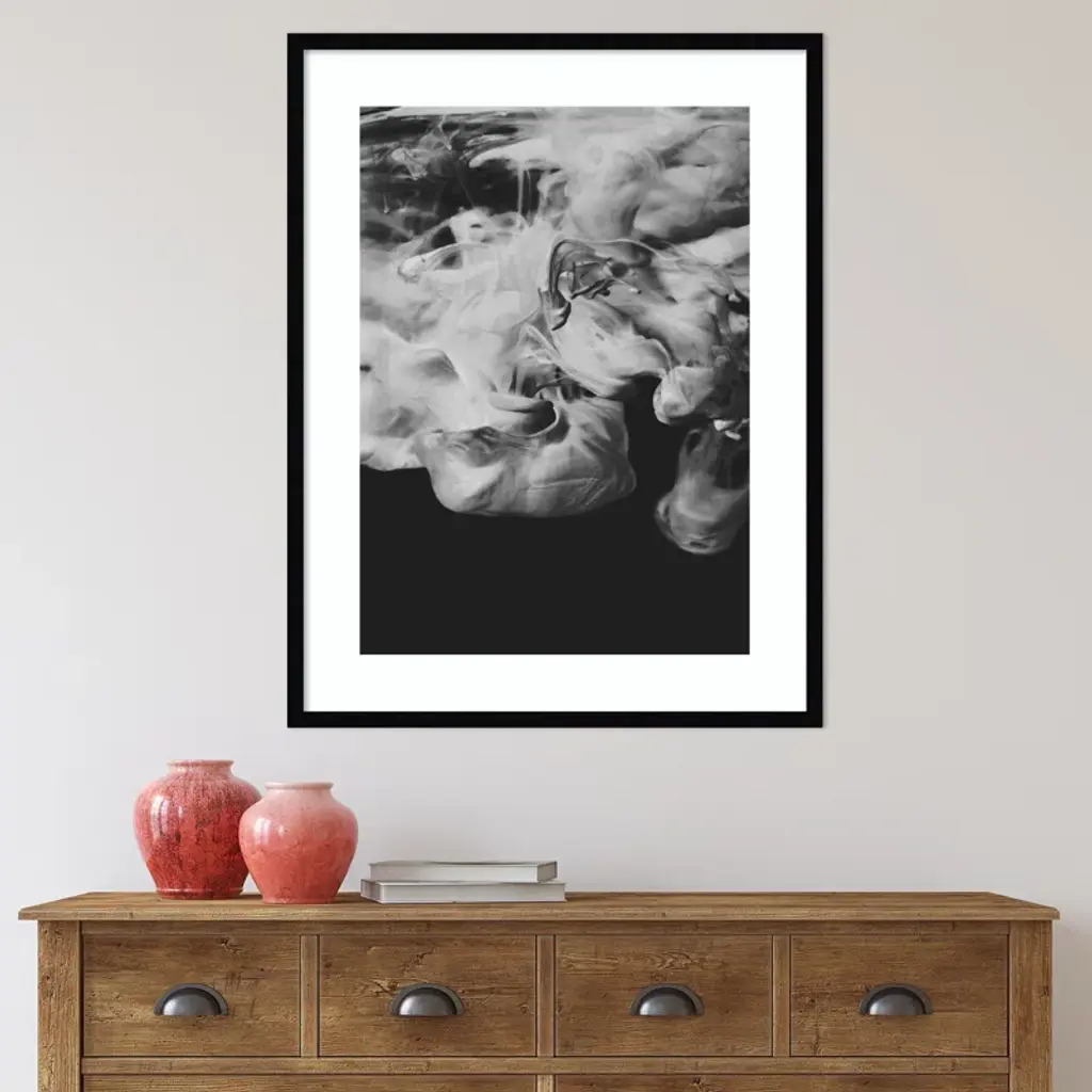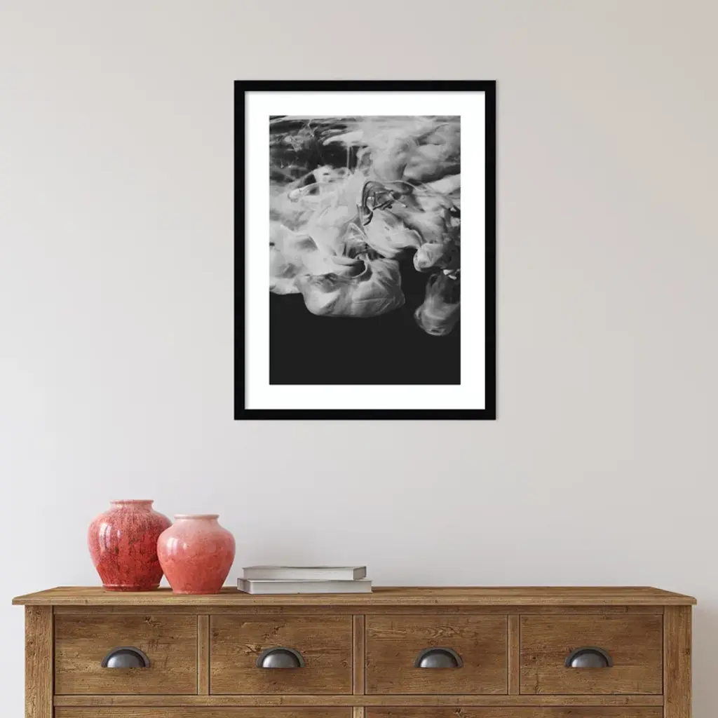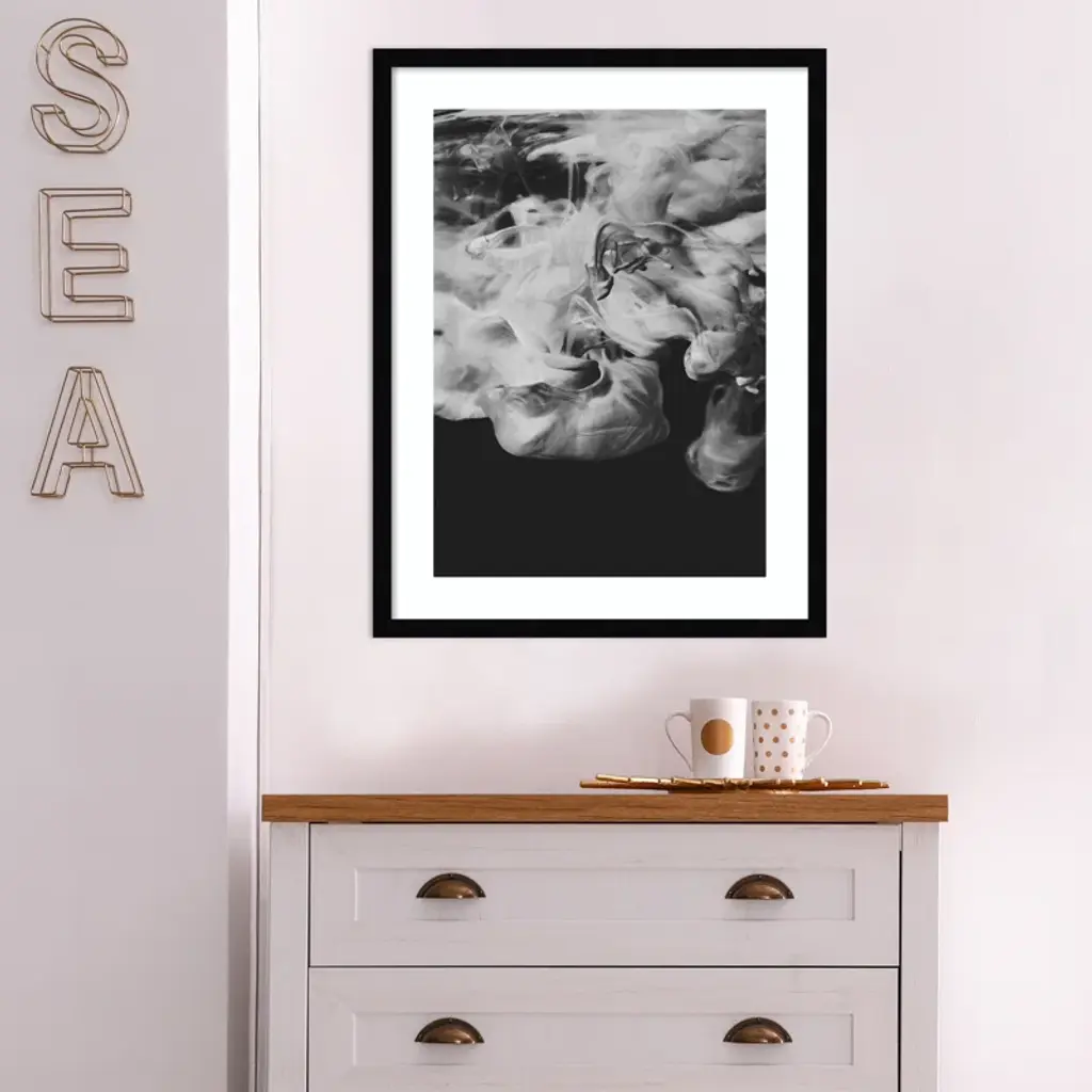 Freeze-frame. Capturing a split-second swirl of ink in water, this black-and-white photographic print invites a moment of stillness – and a closer look. It’s printed on premium paper with fade-resistant inks, mounted to a rigid backer, and framed in solid wood with a gallery-quality acrylic cover. Ready to hang.