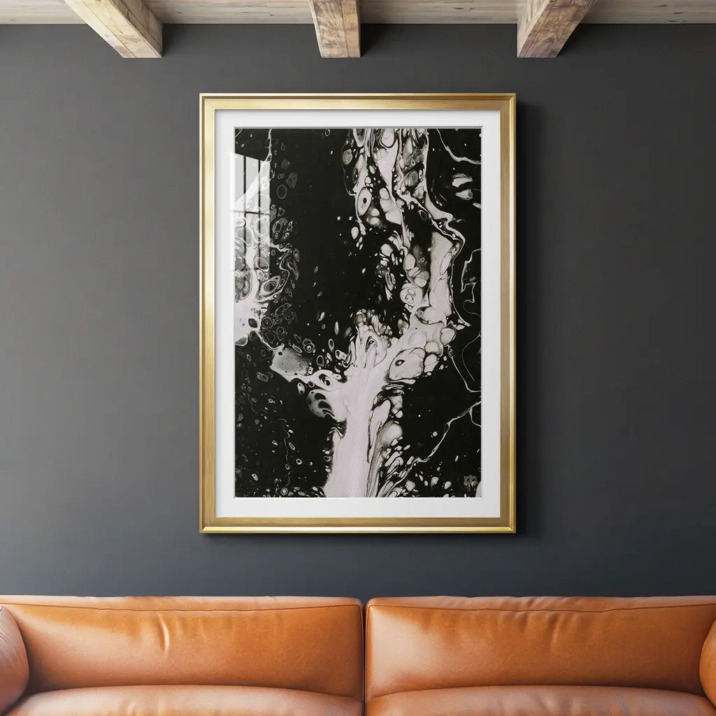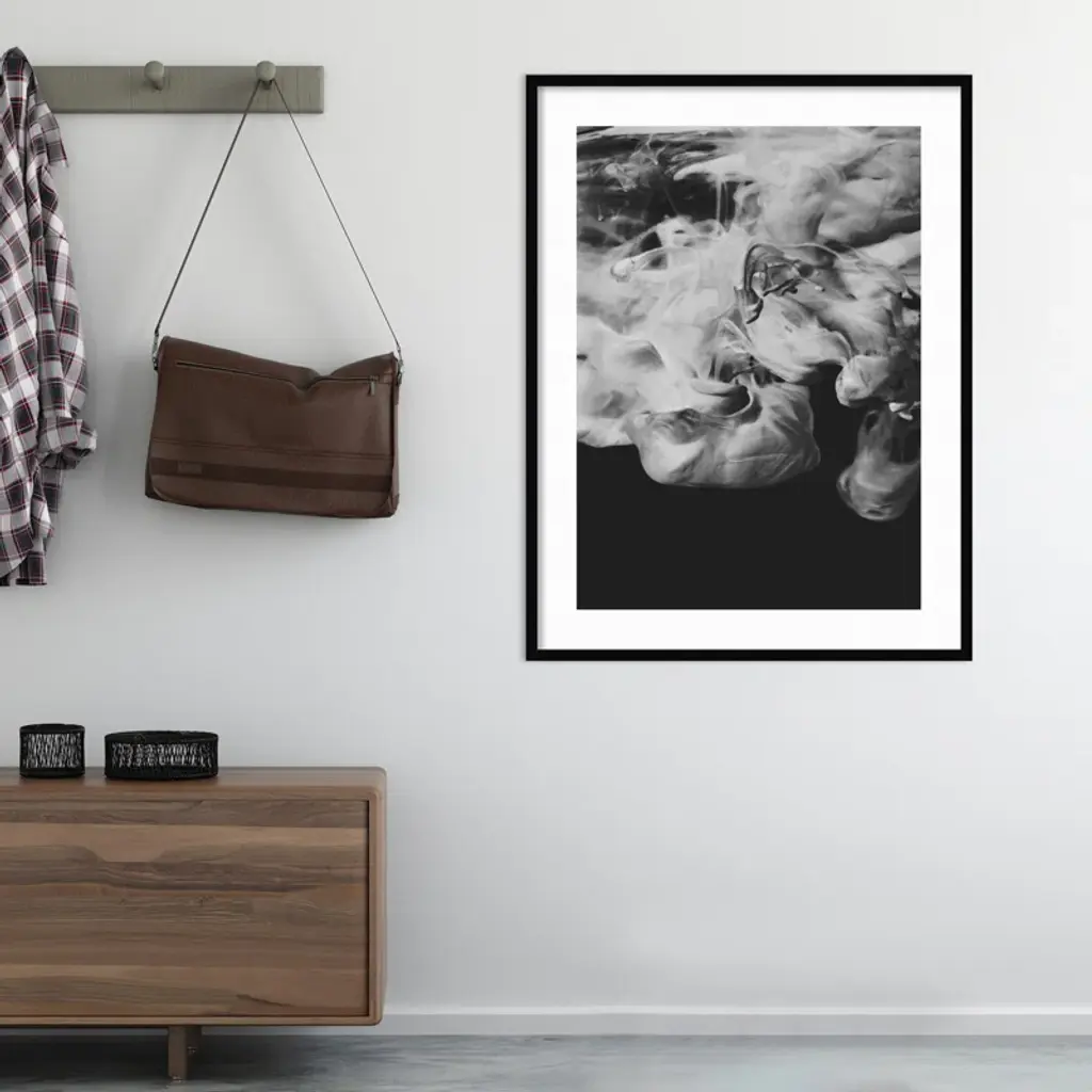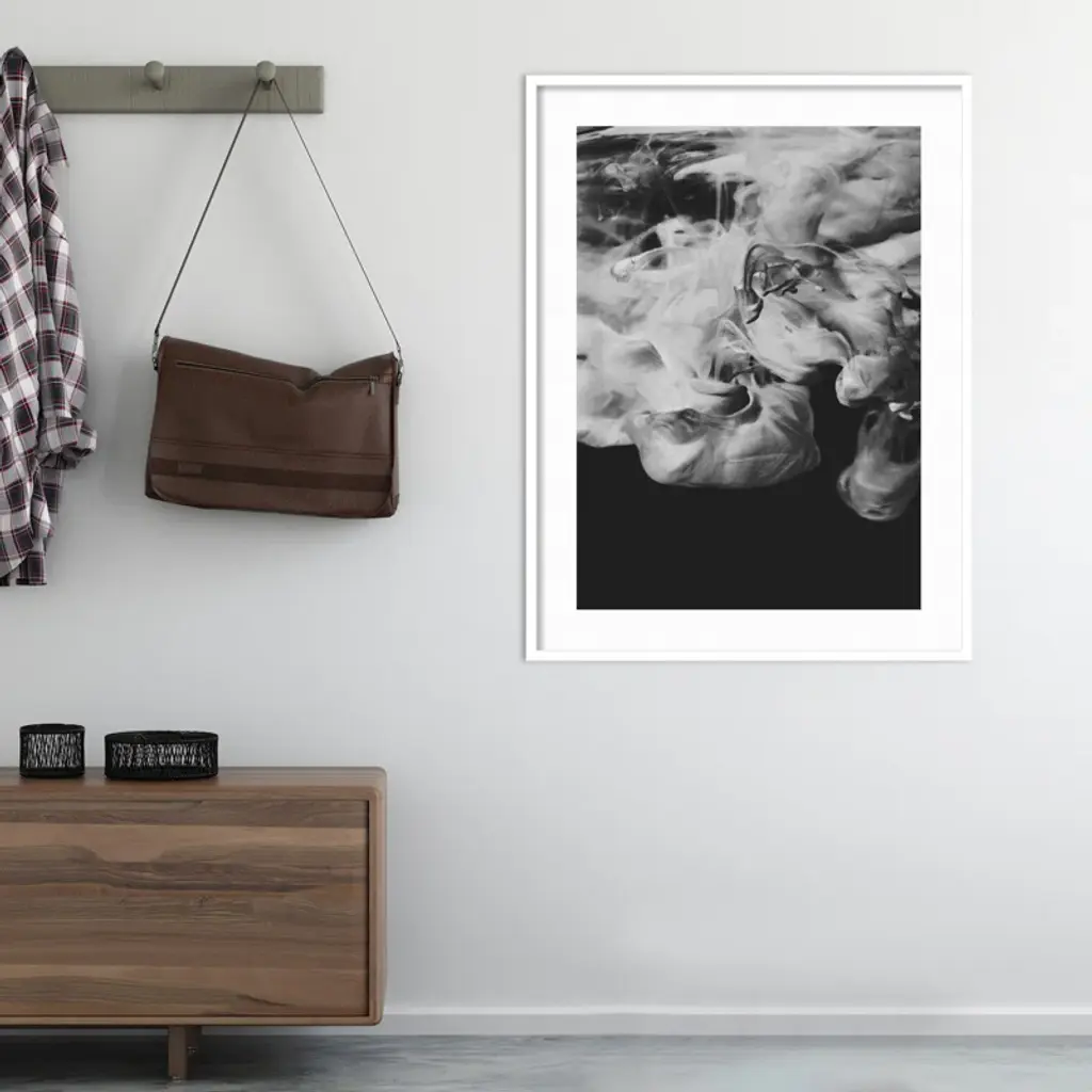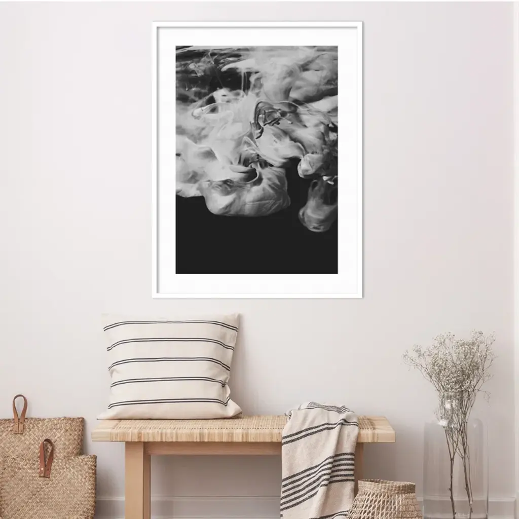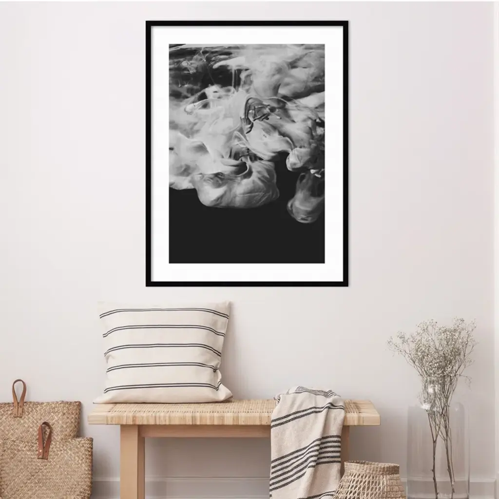 Freeze-frame. Capturing a split-second swirl of ink in water, this black-and-white photographic print invites a moment of stillness – and a closer look. It’s printed on premium paper with fade-resistant inks, mounted to a rigid backer, and framed in solid wood with a gallery-quality acrylic cover. Ready to hang.