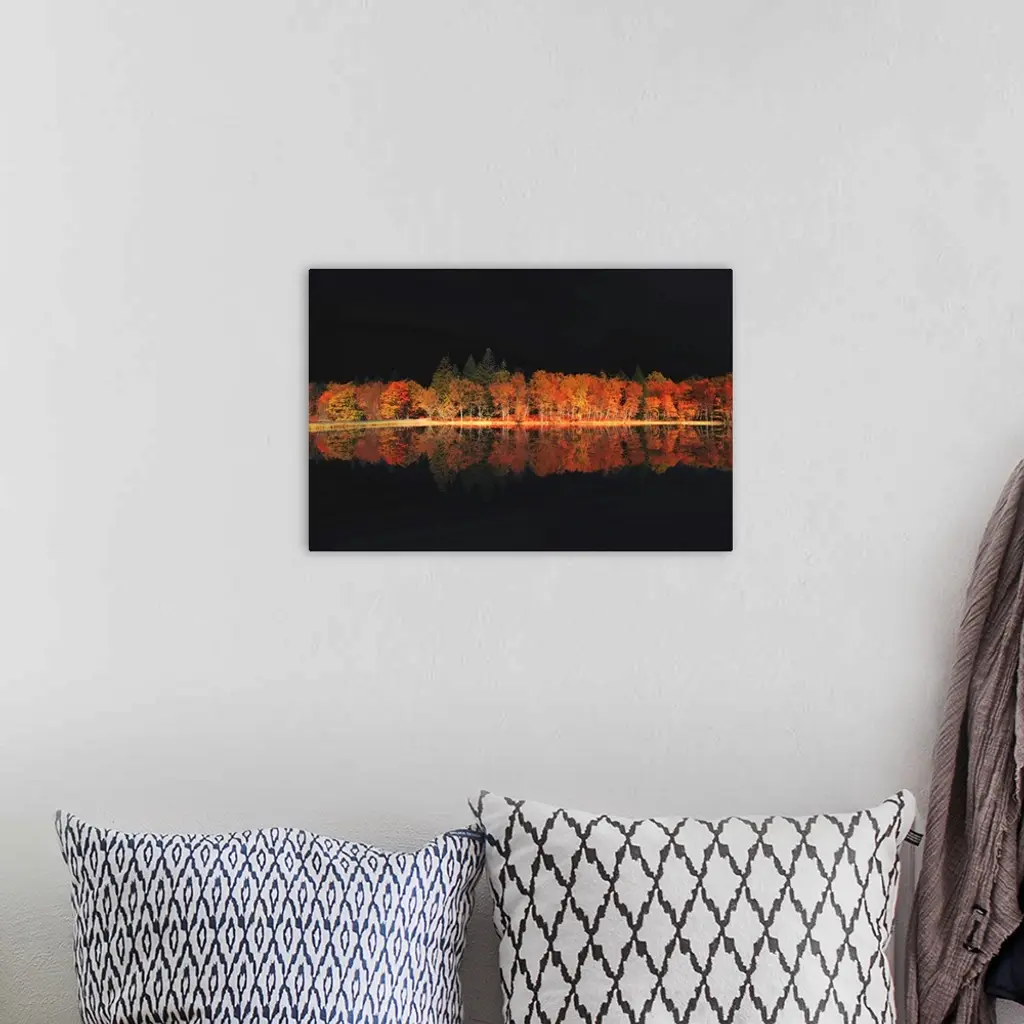 Autumn trees lining a lake and reflecting into the water, with a dark black sky.