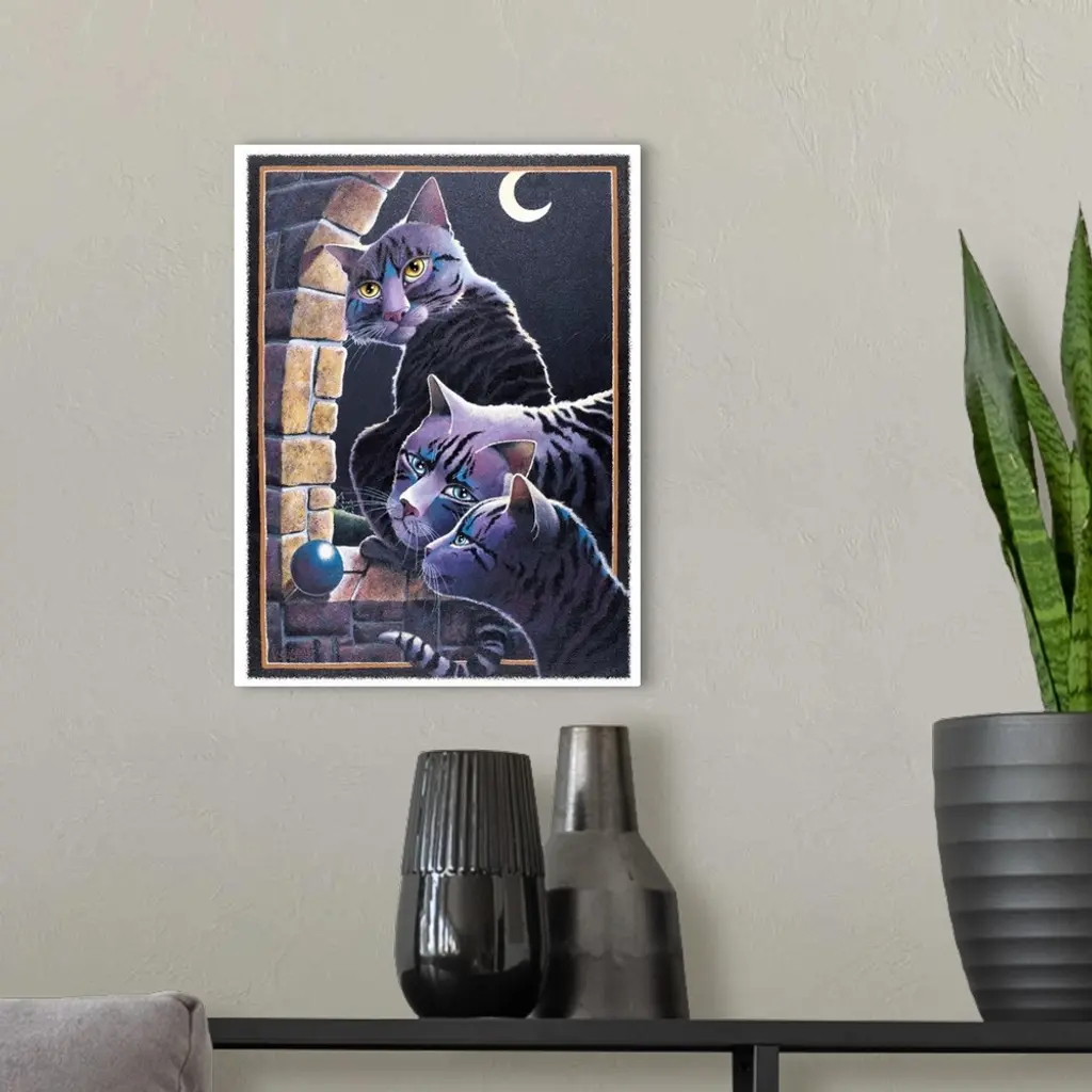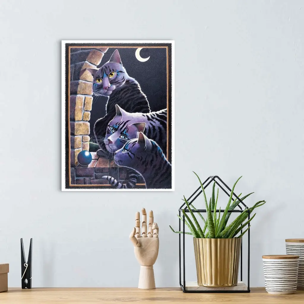 Illustration of three striped cats and a blue ball by a brick window sill lit by the moon.