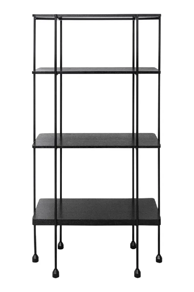 The Highline Toprack by Versmissen exudes modernity. Encased in a sleek black stainless steel frame, this rack is crafted from black oak veneer and features four shelves. Adding a distinctive touch, the bottom part boasts a brushed gold-finished tray shelf. This rack seamlessly integrates into modern spaces, offering a balance of chic design and organizational practicality.