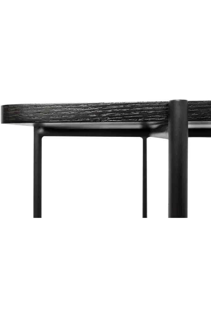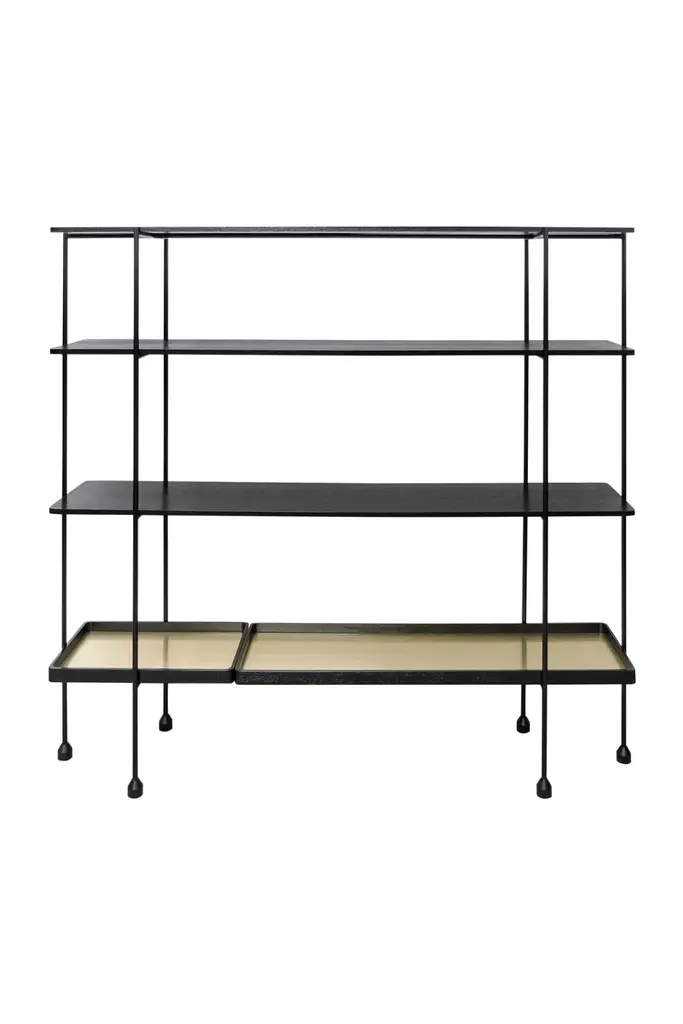 The Highline Toprack by Versmissen exudes modernity. Encased in a sleek black stainless steel frame, this rack is crafted from black oak veneer and features four shelves. Adding a distinctive touch, the bottom part boasts a brushed gold-finished tray shelf. This rack seamlessly integrates into modern spaces, offering a balance of chic design and organizational practicality.