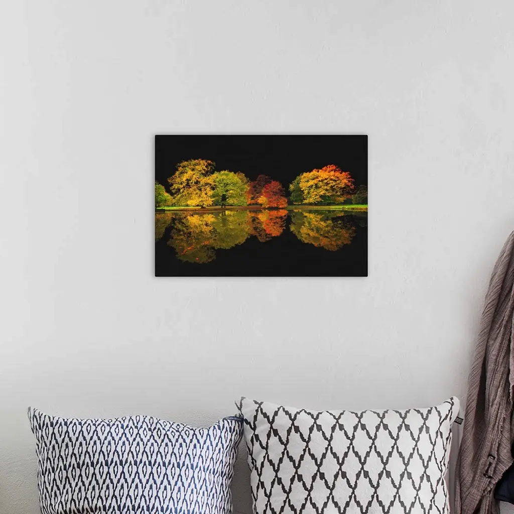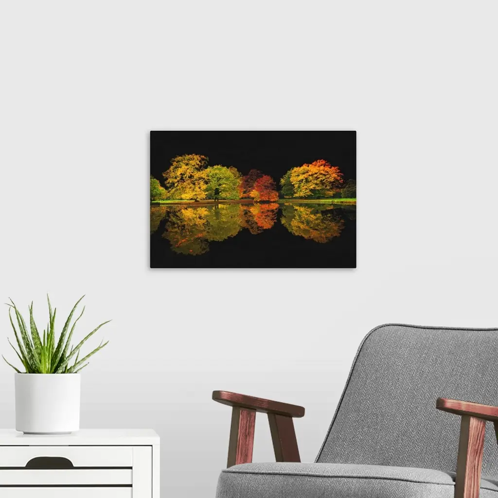 Autumn trees lining a lake and reflecting into the water, with a dark black sky.