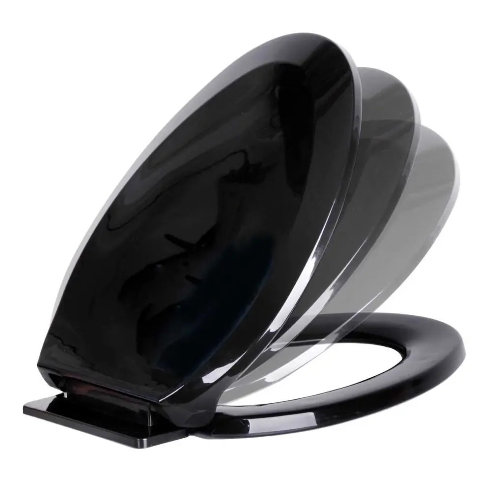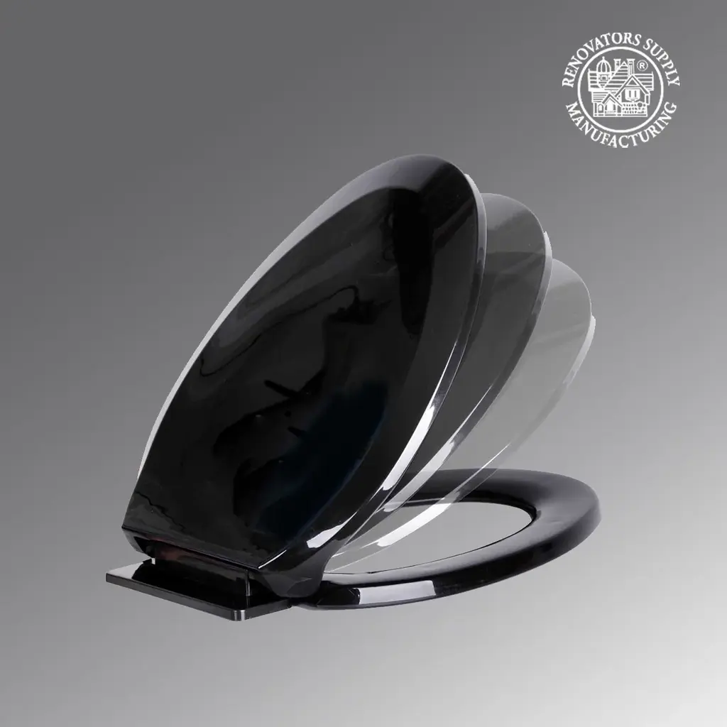 BLACK NO SLAM SLOW CLOSE ELONGATED TOILET SEATS Whether small or large - your bathroom must be comfortable, fulfil its function and relaxing, because here you start and finish every day. Our Ergonomic Design Brings You an Extraordinary Comfort Experience - Quiet-Close Elongated toilet Seat with Durable Material. Made from durable polypropylene plastic with a high gloss finish that won't crack or peel. Its no slip black bumpers won't fall off easily and keep the seat in place.FEATURES - Black colored Durable High Impact plastic resists staining and cracking - Slow closing toilet seat hinge system for a soft close toilet seat lid - Oval toilet seat lid measures 17 1/4 Inches long and 13 3/4 inches wide - Toilet Seat with Quite, Safe and Slow Shut Lid - The Adjustable hinge fits standard hole spacing of 4 to 6 1/2 in. - An Additional front-to-back fine tune adjustment of 1/4 in. - Easy-clean hinges for hassle-free cleaning - Corrosion free hardwareKNOW YOUR TOILET BOWL TYPE BEFORE MAKING YOUR ORDERGenerally, toilet bowls come in two different sizes - Round and Elongated. Measure from the toilet seat bolt holes to the tip of the bowl to know your toilet bowl size. Standard measure: MAINTENANCE Seats are easy to install with conventional tools, all hardware included. It is recommended toilet seats be cleaned with a damp cloth and mild soap. High quality products made by Renovators Supply Manufacturing