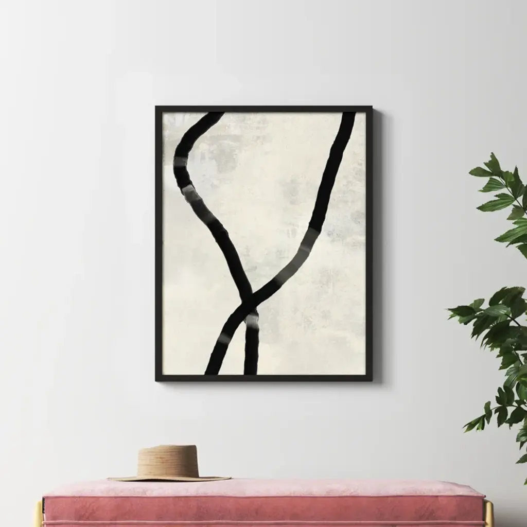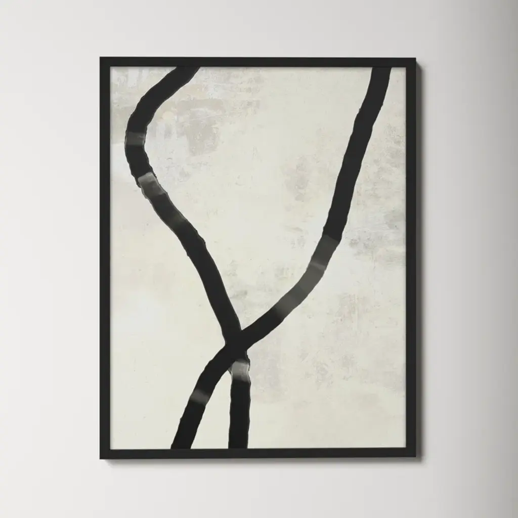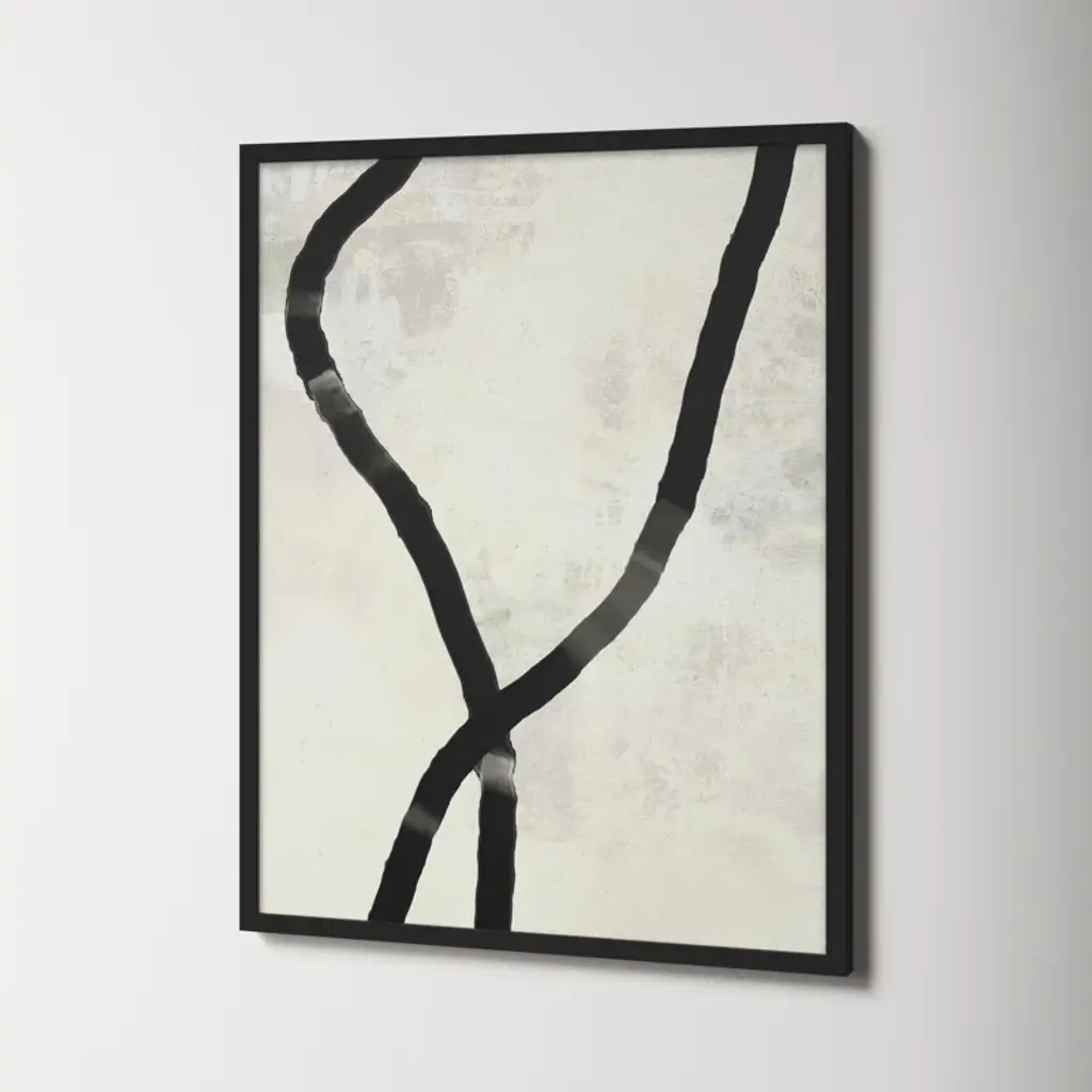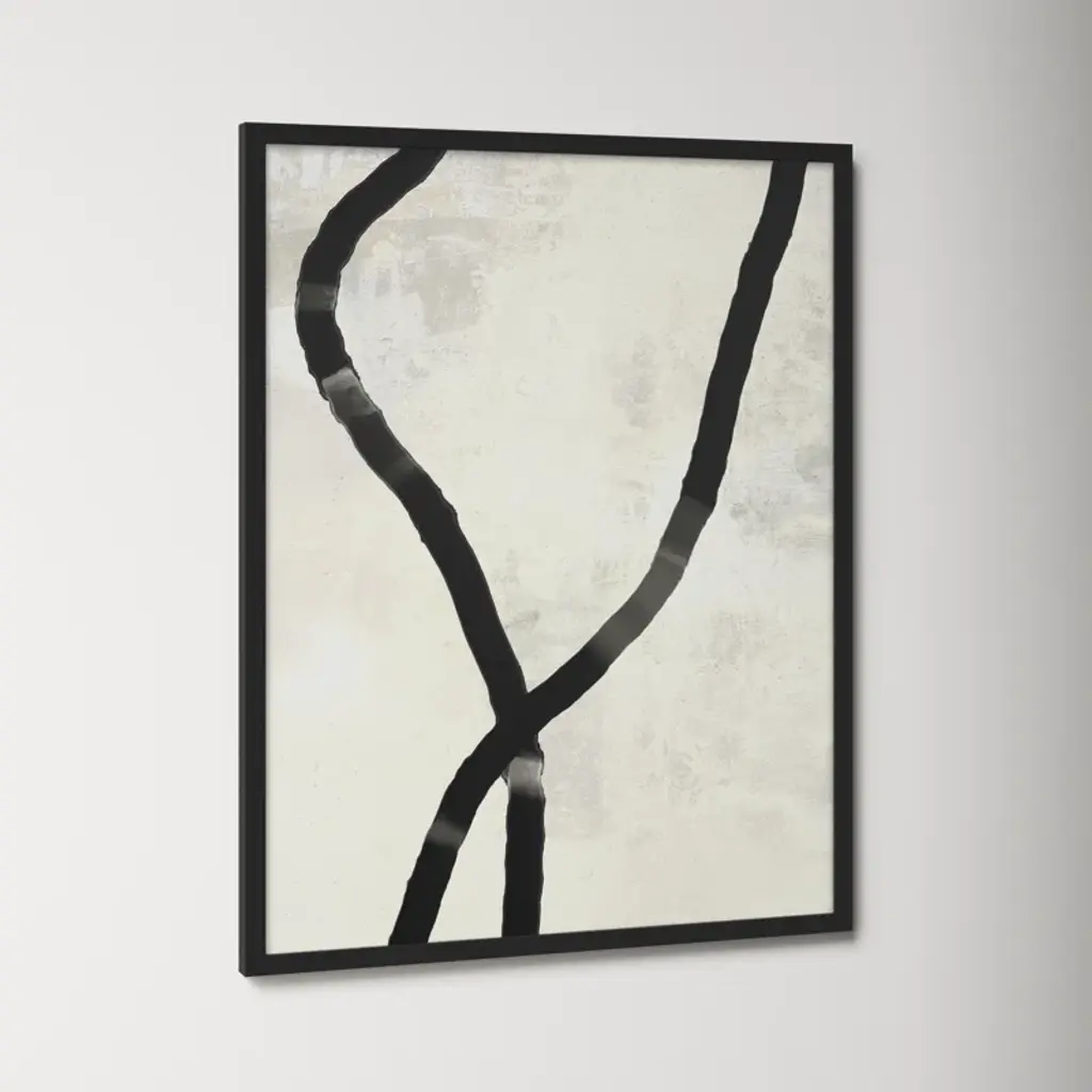 With bold lines and a minimalist composition, this graphic art print plays with negative space for a bold modern look. Printed in the USA, this piece by artist Jacques Pilon features a neutral, stone-like background broken up with a pair of fluid, watercolor-like lines that cross near the bottom of the frame. It's printed on archival paper using giclee inks for an accurate, lasting reproduction of the original work. This piece arrives framed and matted with included wall mounting hardware, so it's ready to hang right out of the box.