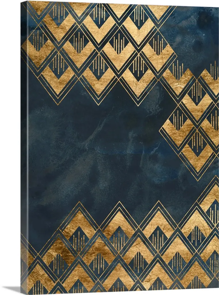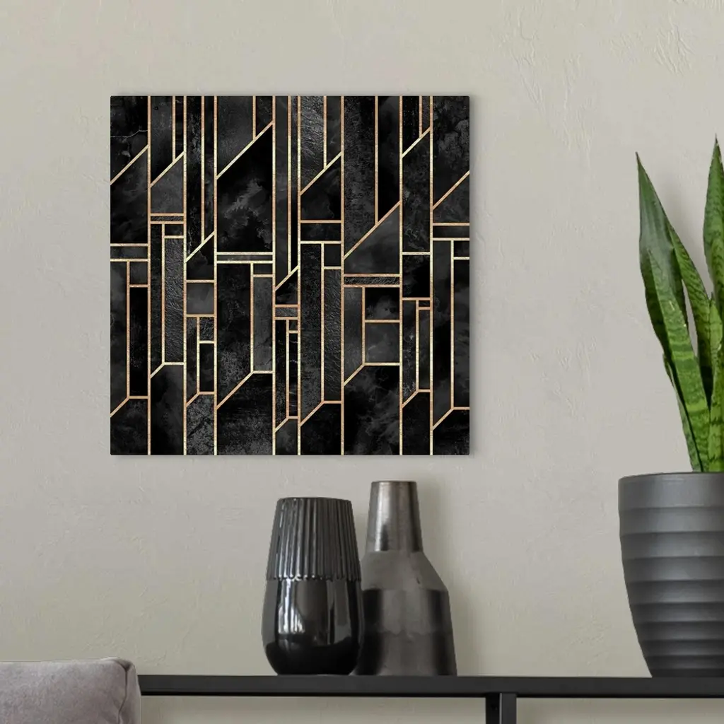 A contemporary, geometric, art deco design in dark shades of grey and black. The shapes are outlined in gold.