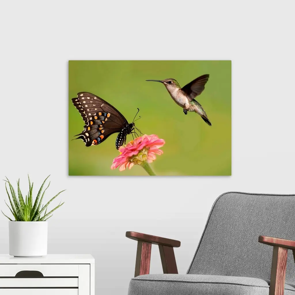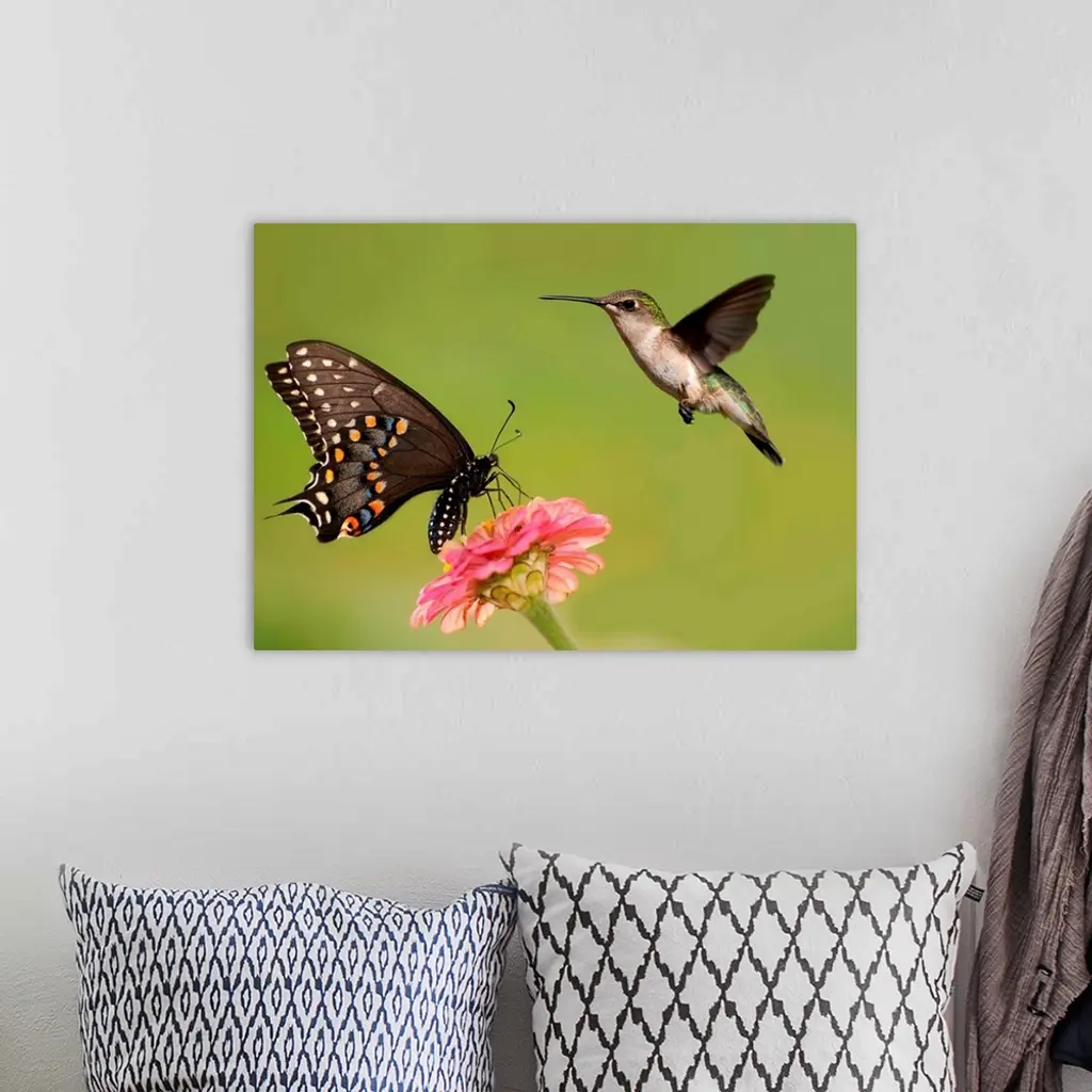 Black Swallowtail butterfly feeding on pink flower with a Hummingbird wall art for home and office decor. Discover canvas art prints, photos, mural, big canvas art and framed wall art in GreatBigCanvas.com's varied collections.