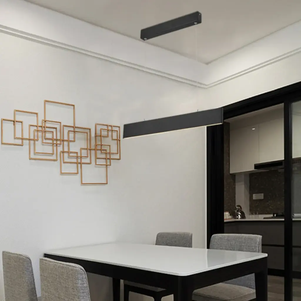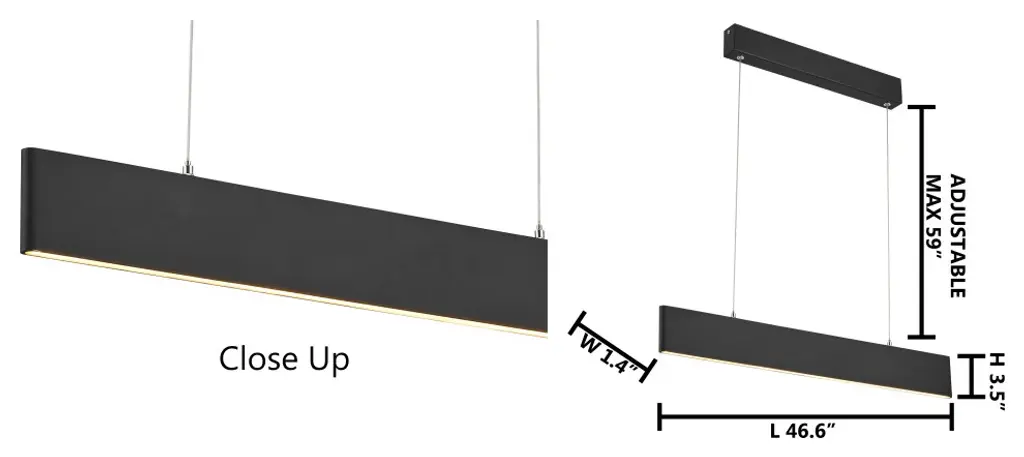 The matte black LED chandelier is a sleek and transitional lighting fixture that adds a touch of sophistication to any room. The thin rectangular frame is made from a durable and long-lasting material, providing a sturdy construction that can withstand the test of time. The 46W LED bulb emits a warm and cozy 3000K light, perfect for creating a relaxing and inviting atmosphere. The dimensions of the light are 46.6 inches in length, 1.4 inches in width, and 3.5 inches in height, making it a slim and space-saving option for any room. The black finish adds a touch of elegance and sophistication, allowing it to blend seamlessly into any modern decor. Overall, this light is a great choice for anyone looking to add a stylish and modern touch to your bedroom, living room, dinning room, or kitchen island.Color: BlackSize: L46.6" W1.4" H3.5"Materials: MetalLighting Specs:Commercial Use: YesUL Certified: YesETL Certification: NoLight bulbs includedBulb Type: LEDMax Wattage: 46W