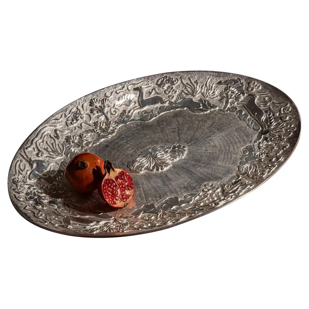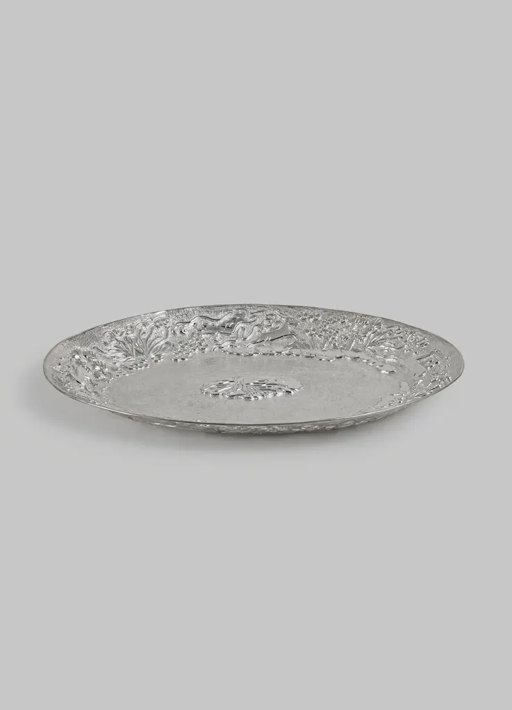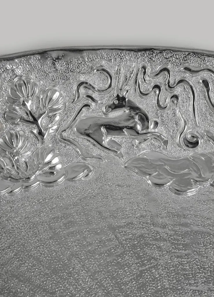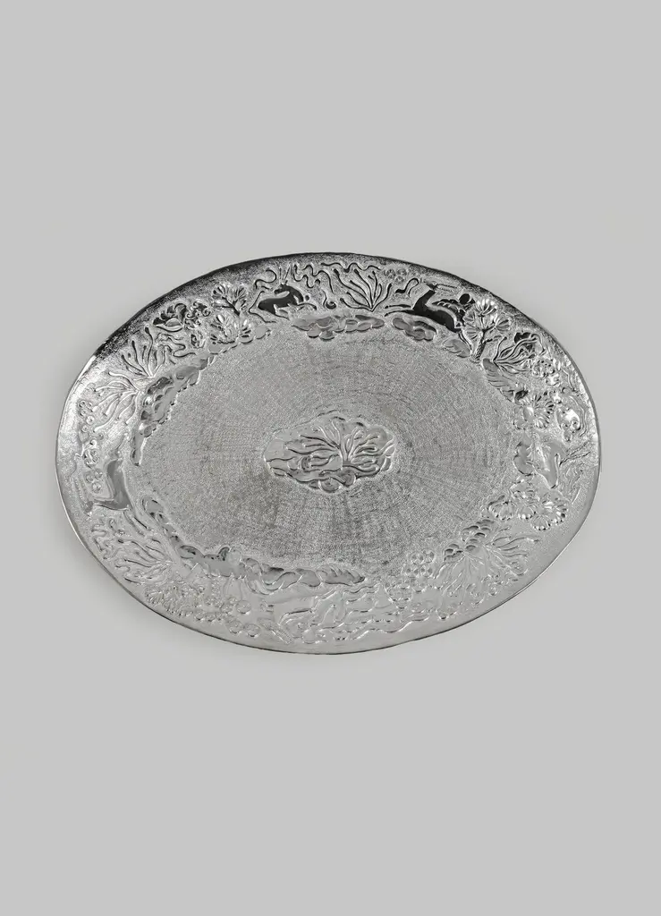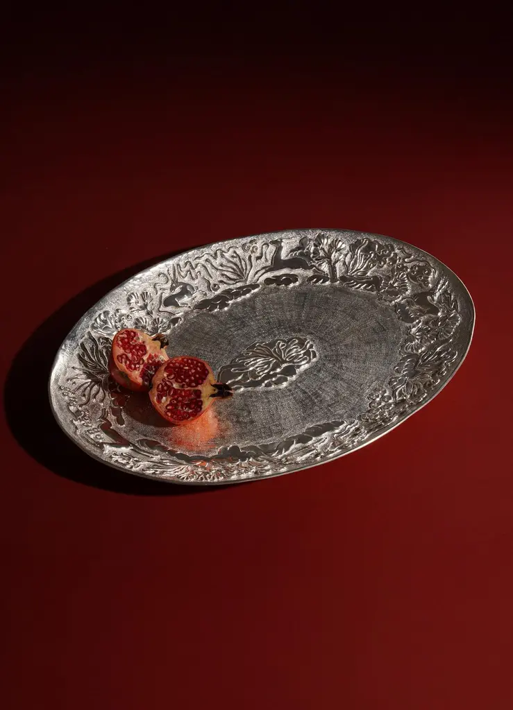 Blackbuck Silver Plated Platter Medium in Brass, Viya by Vikram Goyal"Repoussé involves hammering low-relief designs into malleable metal sheets from the reverse that originated around the 3rd or 4th century B.C., in the Middle East. In India, the technique was traditionally used to make temple doors and ceilings with devotional themes. The studio explores this process through organic abstract patterns and also gives contemporary life to classical themes from the visual decorative arts. In order to achieve this, months are spent experimenting and sampling the detailed, time-consuming technique. The final outcome is a result of the synergy between designer and artisan: a detailed two-dimensional artwork is realised in sheet metal through the intuitive and skilled process of applying the right amount of pressure to elevate the forms."Platter in brass and silver. Handmade in India.Product DetailsMaterial: BrassSize: 17.75"L x 13.5"W x 1"H 45.1 L x 34.3 W x 2.5 H cmWeight: 1.6 kg 3.52 lbsNumber of Pieces: 1 PlatterSKU: VPT1606This product has been handcrafted by local artisans. As such, slight variations are a testament to the unique character of a piece made by hand.