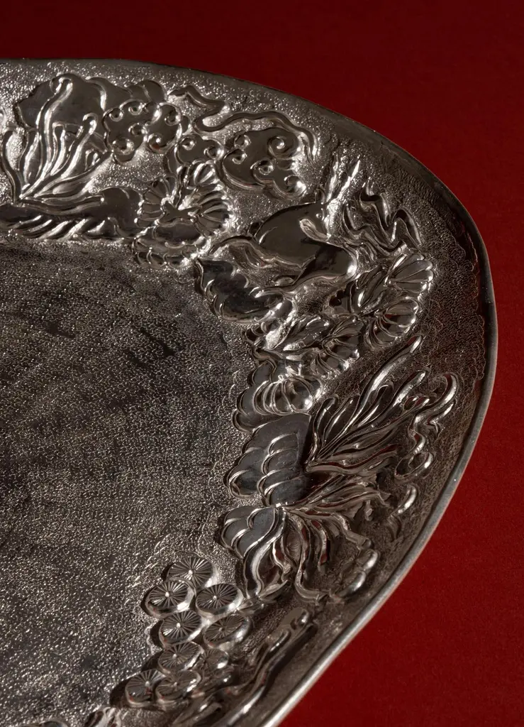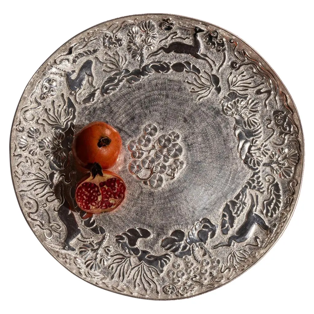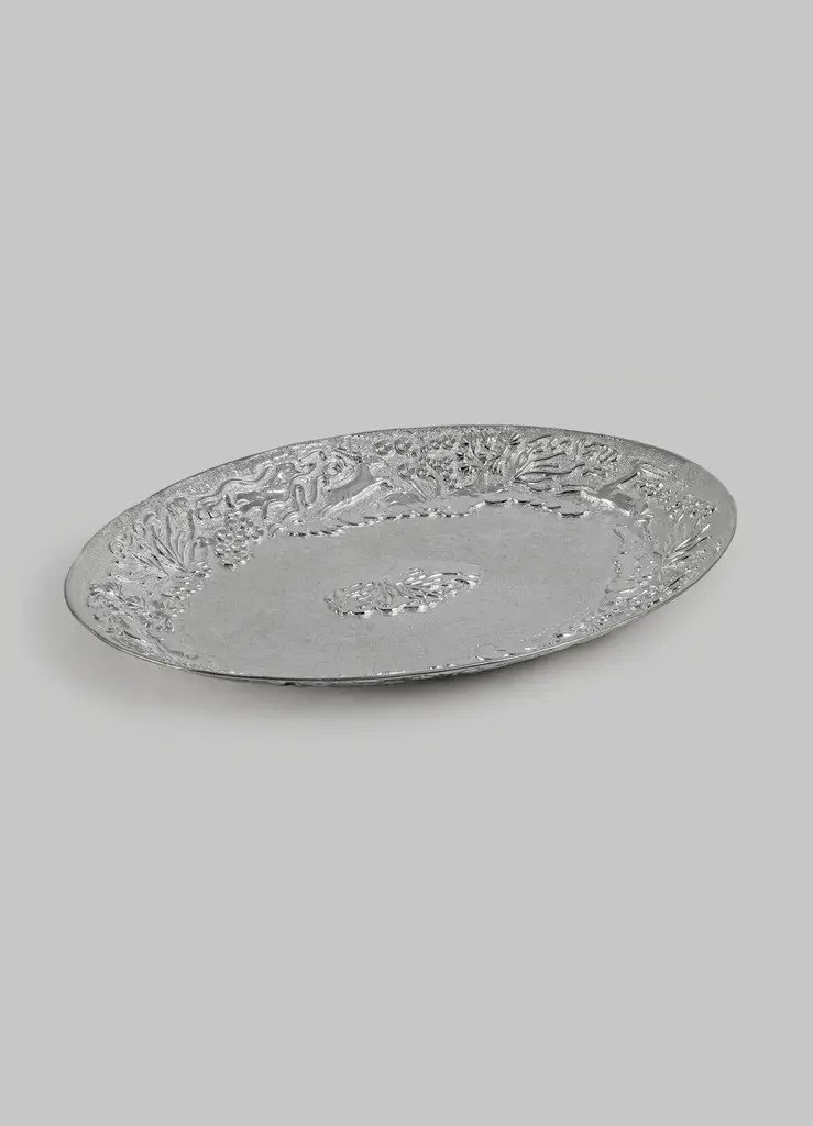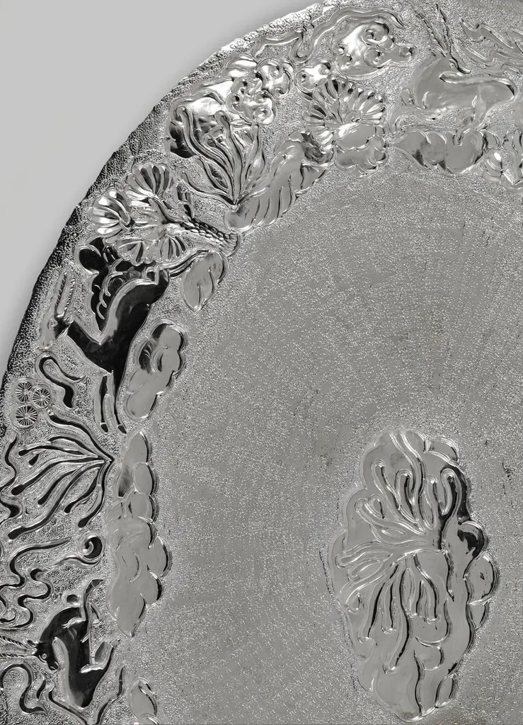 Blackbuck Silver Plated Platter Medium in Brass, Viya by Vikram Goyal"Repoussé involves hammering low-relief designs into malleable metal sheets from the reverse that originated around the 3rd or 4th century B.C., in the Middle East. In India, the technique was traditionally used to make temple doors and ceilings with devotional themes. The studio explores this process through organic abstract patterns and also gives contemporary life to classical themes from the visual decorative arts. In order to achieve this, months are spent experimenting and sampling the detailed, time-consuming technique. The final outcome is a result of the synergy between designer and artisan: a detailed two-dimensional artwork is realised in sheet metal through the intuitive and skilled process of applying the right amount of pressure to elevate the forms."Platter in brass and silver. Handmade in India.Product DetailsMaterial: BrassSize: 17.75"L x 13.5"W x 1"H 45.1 L x 34.3 W x 2.5 H cmWeight: 1.6 kg 3.52 lbsNumber of Pieces: 1 PlatterSKU: VPT1606This product has been handcrafted by local artisans. As such, slight variations are a testament to the unique character of a piece made by hand.